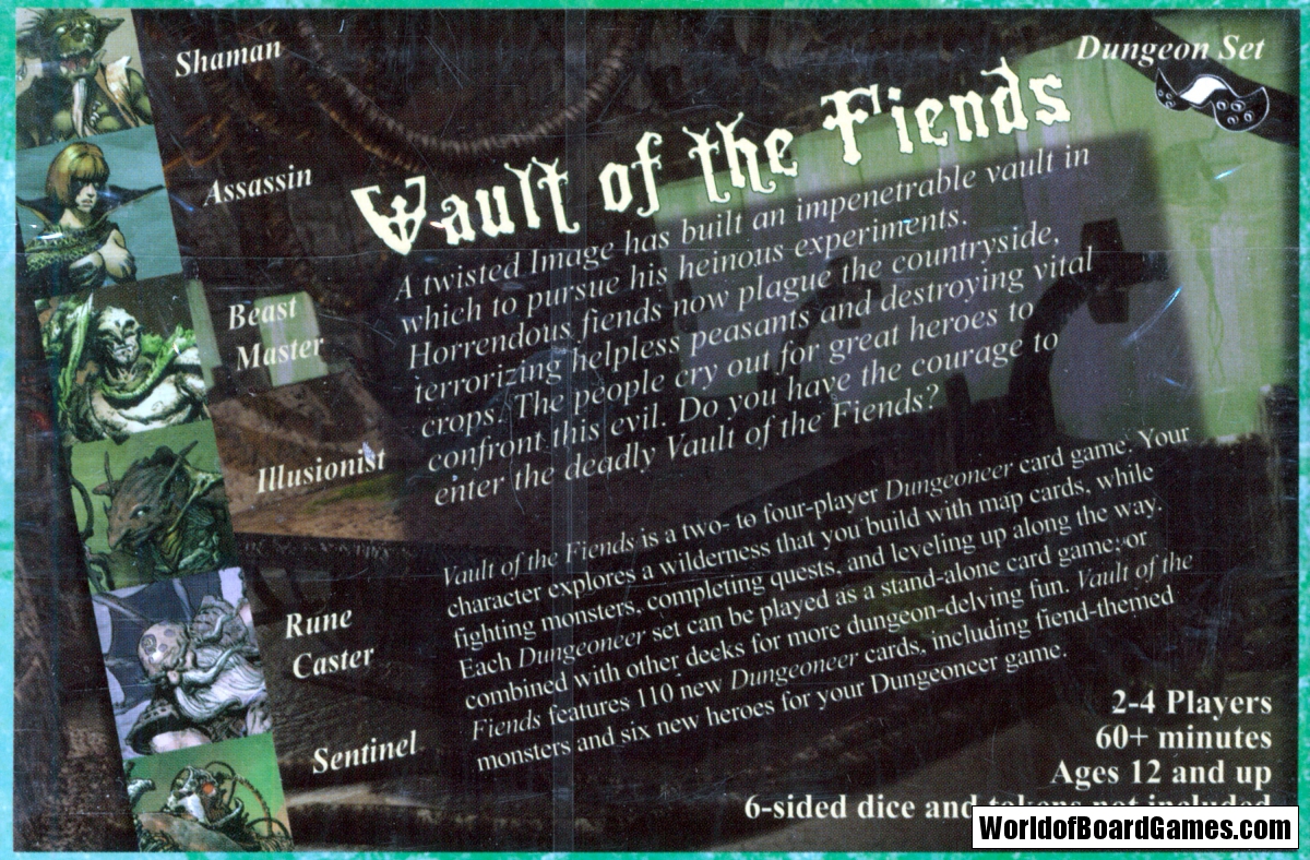 Vault of the Fiends is a two- to four-player Dungeoneer card game. Your character explores a wilderness that you build with map cards, while fighting monsters, completing quests, and leveling up along the way. Each Dungeoneer set can be played as a stand-alone card game, or combined with other decks for more dungeon-delving fun. Vault of the Fiends features 110 new Dungeoneer cards, including fiend-themed monsters and six new heroes for your Dungeoneer game: Gnome Illusionist, Dwarven Runecaster, Ork Shaman, Drakan Sentinel, Human Beastmaster, and Elf Assassin.