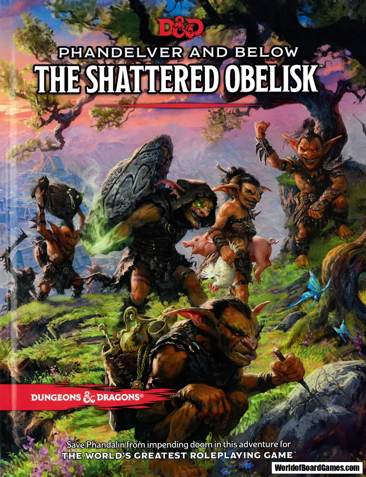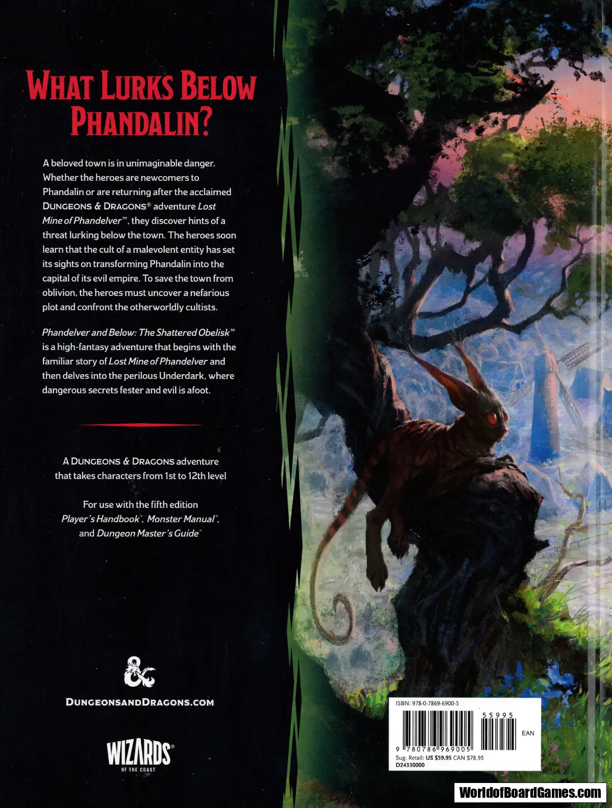 Phandelver and Below: The Shattered Obelisk is a high-fantasy adventure that begins in the beloved town of Phandalin as it faces unimaginable danger. Whether the heroes are newcomers to Phandalin or are returning after the acclaimed Dungeons & Dragons adventure Lost Mine of Phandelver, they discover hints of a threat lurking below the town. The heroes soon learn that the cult of a malevolent entity has set its sights on transforming Phandalin into the capital of its evil empire. To save the town from oblivion, the heroes must uncover a nefarious plot and confront the otherworldly cultists directly.