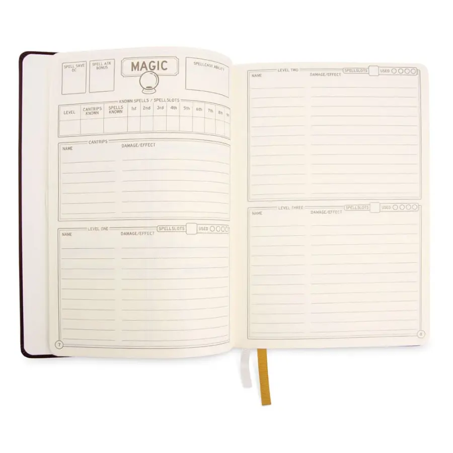Förutom alla de vanliga sakerna du förväntar dig av ett karaktärsblad erbjuder den här anteckningsboken också möjligheten att spåra trollformler, trollformelsplatser, mynt, byte, anpassningsbara karaktärsresurser, platser, komponenter, magidrycker och mycket mer!