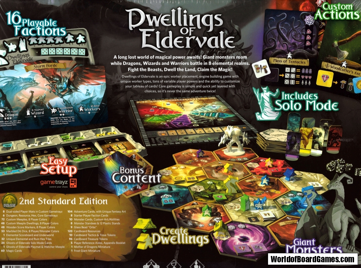 Dwellings of Eldervale is an epic worker placement game set in a once lost magical world. Giant elemental monsters roam while dragons, wizards and warriors battle for dominance over 8 elemental realms. Players control unique factions seeking to adventure, battle, grow in power and ultimately dwell Eldervale, shaping it to their vision.