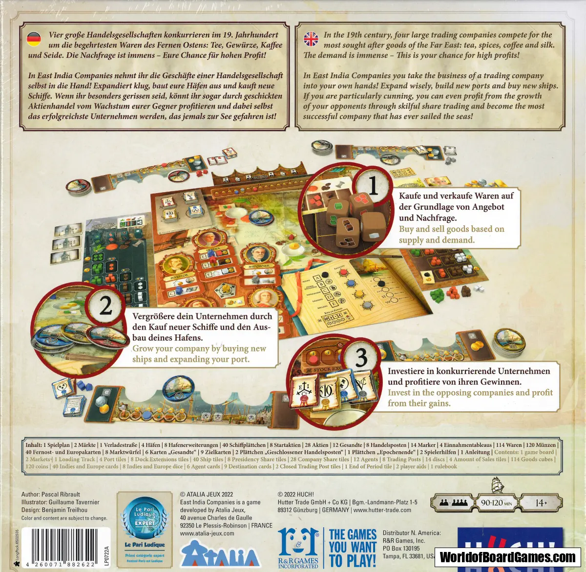 In the 18th and 19th centuries, shipping companies strengthens the trade between the West and the Far East that have begun in previous centuries. Tea, spices, coffee, and silk are commodityes much consumed in Europe, and their buying and selling prices depend closely on supply and demand. Fortunes can be made and gambled depending on circumstances. In East India Companies, players manage a large shipping company that trades with far-flung trading posts in India. They must manage their ships and invest in buying shares of their own company or those of their competitors. And most importantly, players have to keep an eye on the constantly fluctuating market prices! Is it better to invest your money in the stock market or in buying goods? Do they prefer to use fast ships with low tonnage or slower ships with larger holds? Whatever the players choose, their strategies will influence those of their opponents.