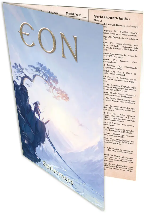 Spelarmappen är ett utomordentligt hjälpmedel för dig som Eonspelare. Utöver det rent praktiska i att kunna samla rollformulär och anteckningar i en mapp så är det innehåller den även regelsammanfattning för rollpersonsskapande, färdighetsanvändning, strid och magi.