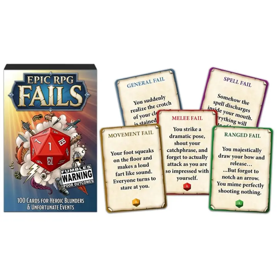 Epic RPG Fails turns critical mishaps into pure entertainment with a deck of one hundred prompts tailored for melee mistakes, magical misfires, ranged disasters, and every chaotic scenario in between.