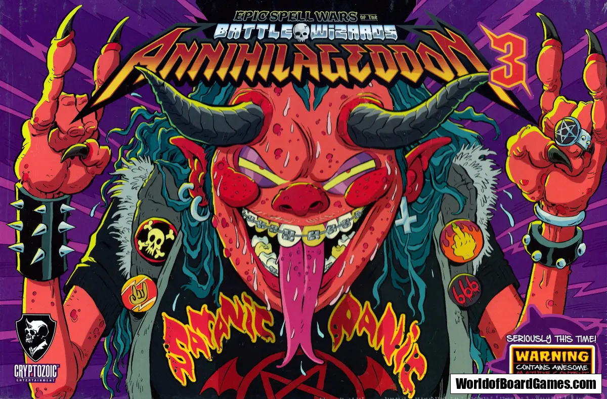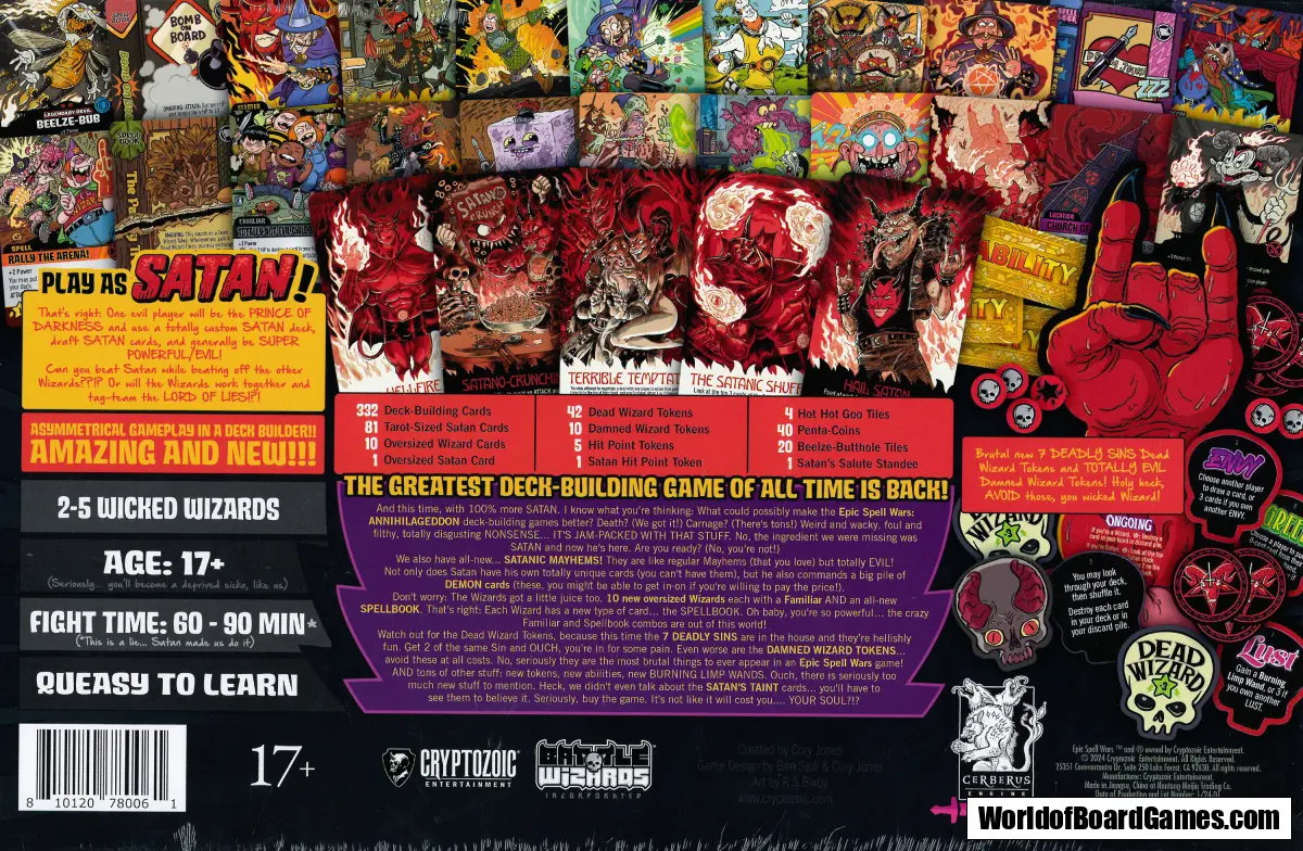 Compatible with other Cerberus Engine releases, Epic Spell Wars of the Battle Wizards: Annihilageddon 3 – Satanic Panic features more chaos with new Mayhems, Familiars, Champions, Wizards, Spells, Creatures, Treasure, and new tarot-sized cards for Satan!