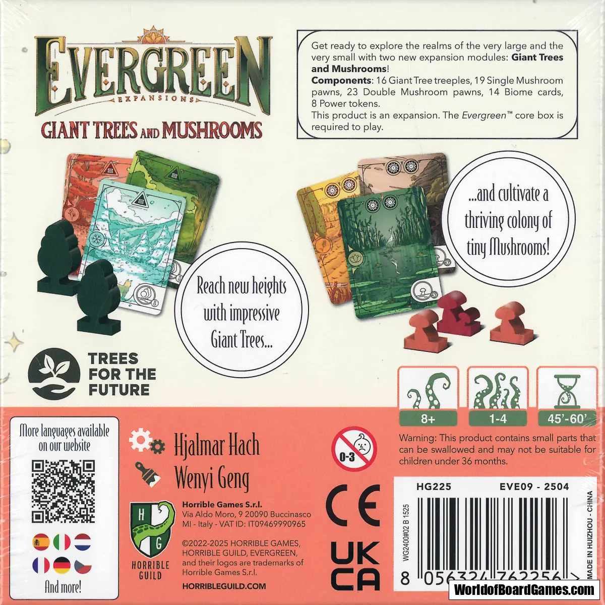 Evergreen – Giant Trees and Mushrooms is a set of 2 modular expansions for Evergreen. This set introduces Giant Trees, an additional growth step beyond Big Trees, and Mushrooms, which thrive in the shadows! Discover new forest-planning strategies to get the most points out of them!