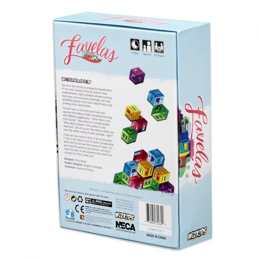 Favelas is a tile laying game about the beautification of the iconic Favelas of Rio de Janeiro! These stacked and everevolving neighborhoods are home to many people who stand to benefit greatly from this infusion of money, modernization and beauty.