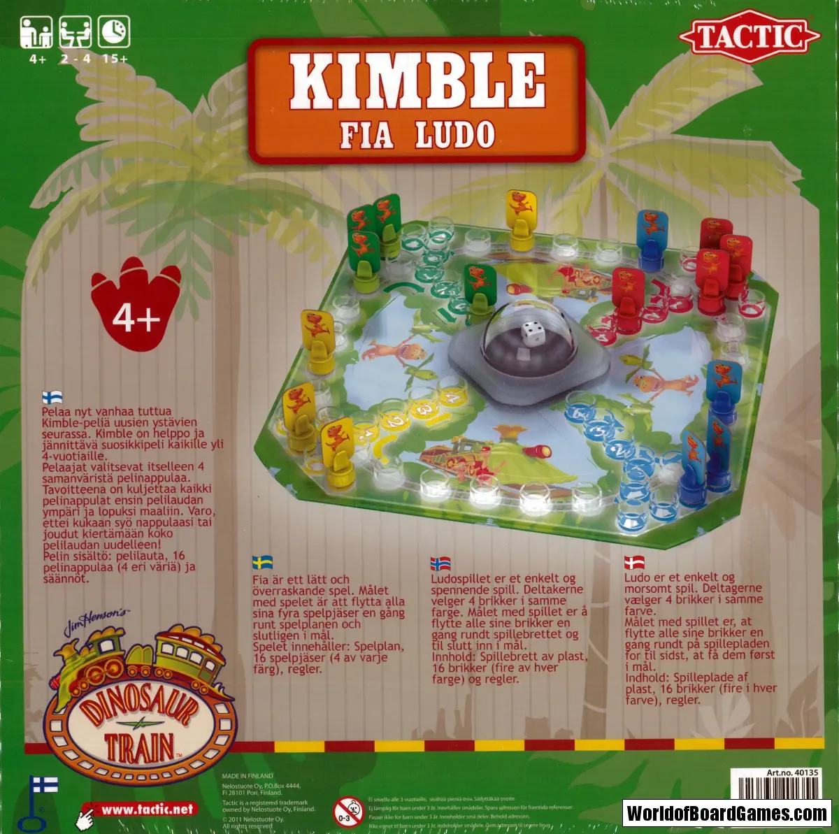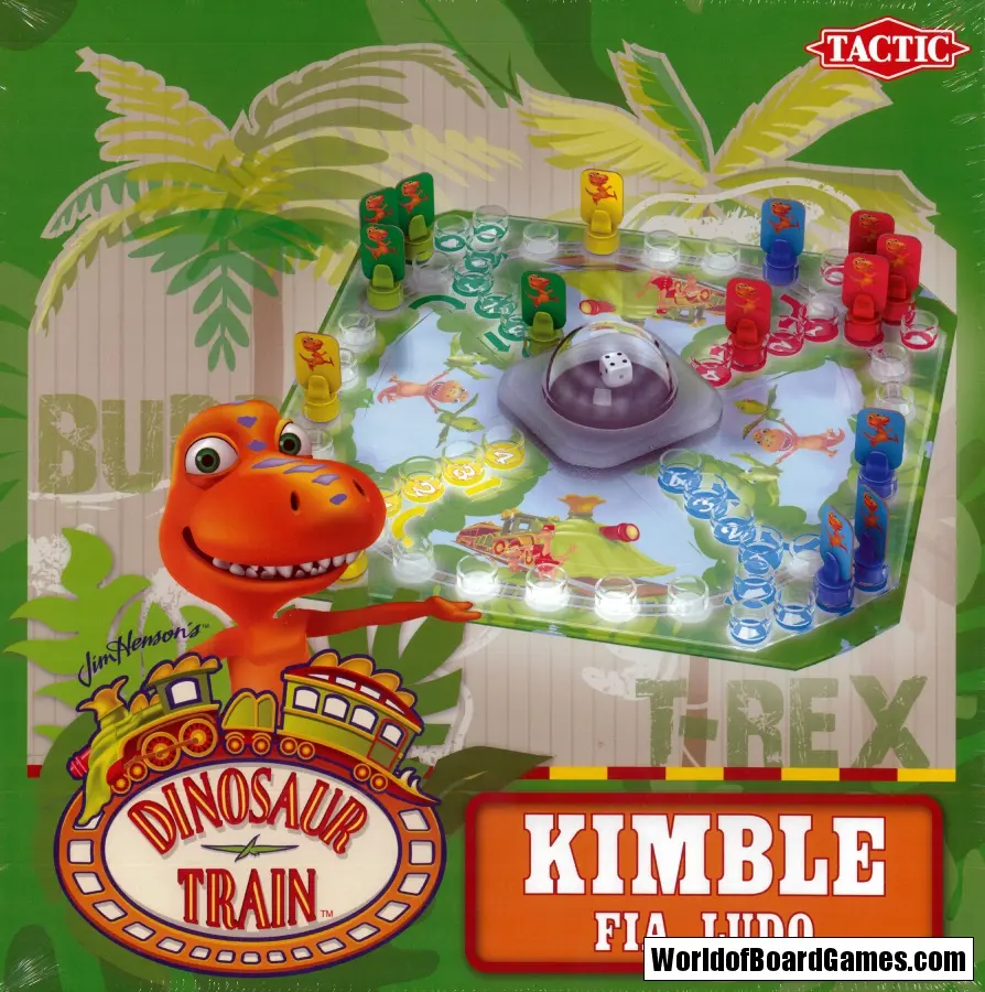 Fia med Dinosaurietåget! Med dinosauriefigurer från SVTs roliga animerade serie Dinosaurietåget ska du ta dig runt banan. Den skojiga pop-o-matic-tärningen bestämmer hur många steg du får gå, men se upp! Om du krockar med någon annans dinosaurie är det tillbaka in i boet! Först i mål med sina fyra dinosaurier vinner.
