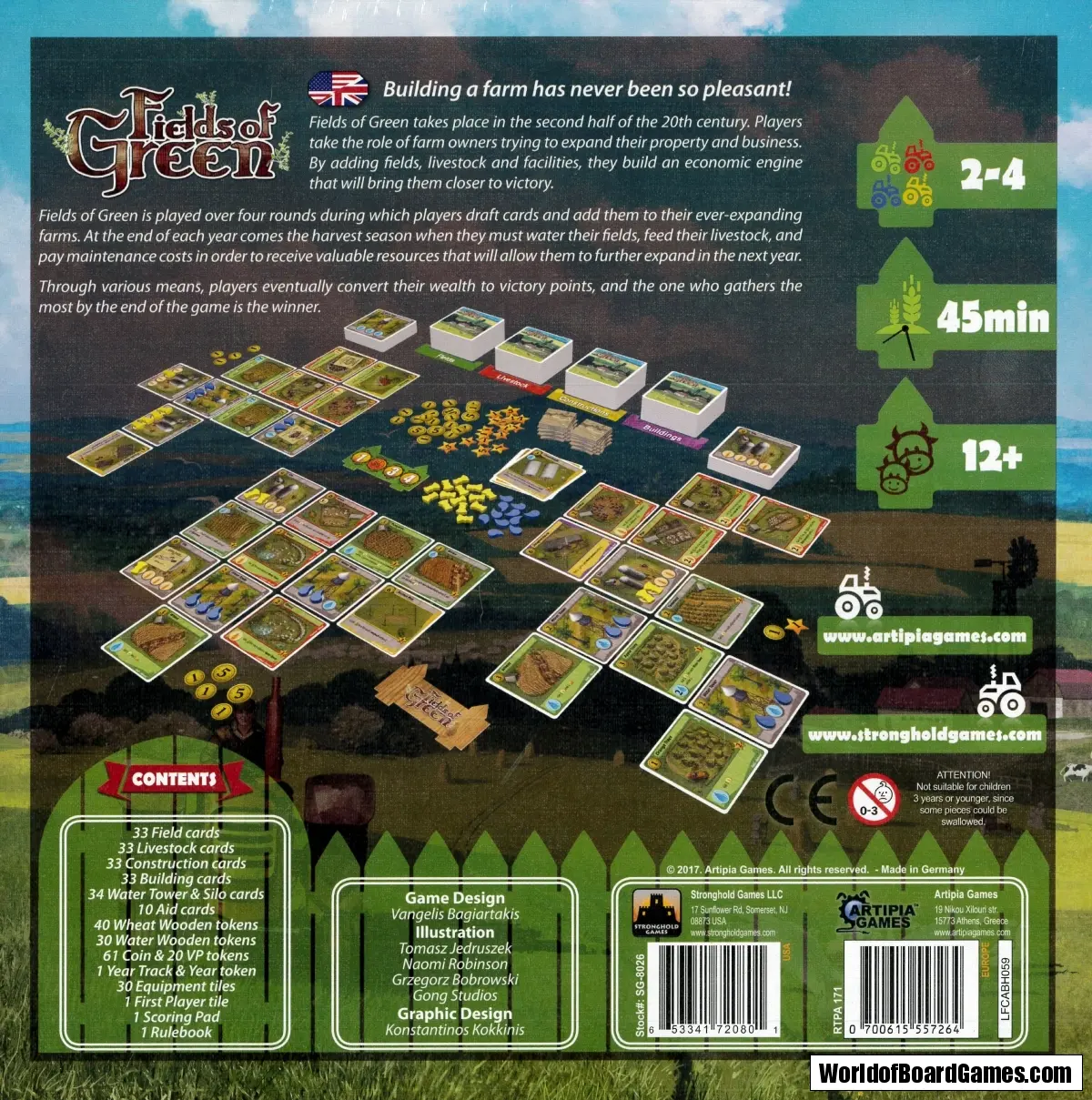 Fields of Green, inspired by Among the Stars, is played over four rounds (years) during which players draft cards and add them to their ever-expanding farms. At the end of each year comes the harvest season when they must water their fields, feed their livestock, and pay maintenance costs in order to receive valuable resources that will allow them to further expand in the next year.