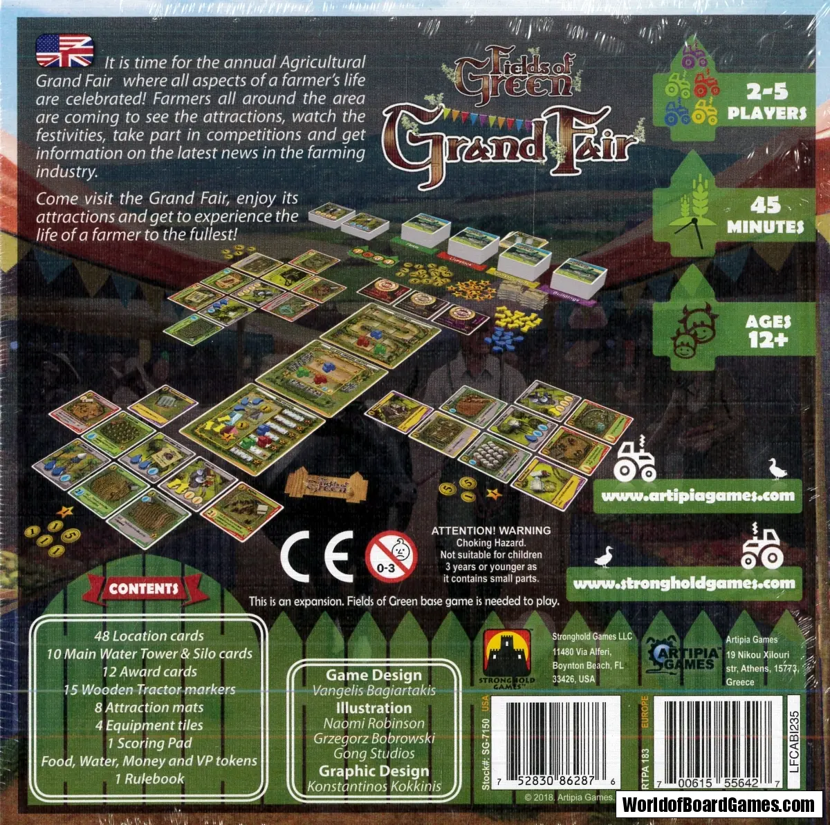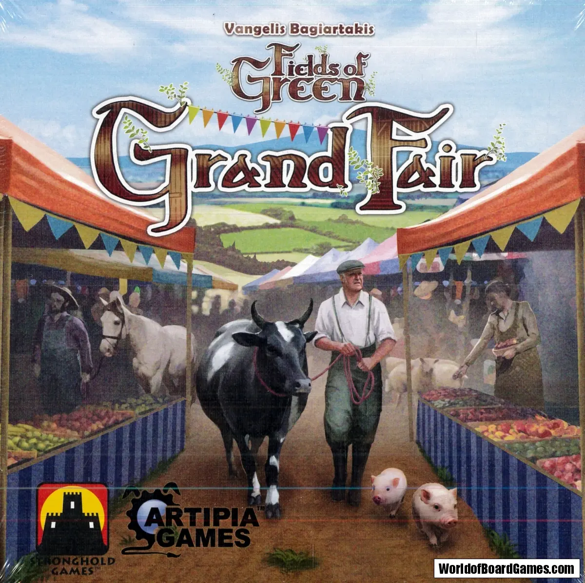 Grand Fair, an expansion for Fields of Green, introduces the Grand Fair Attractions, which let the players interact with the Grand Fair in many new and exciting ways! It also includes additional locations,objectives, components for a fifth player and rules and material for solo game.