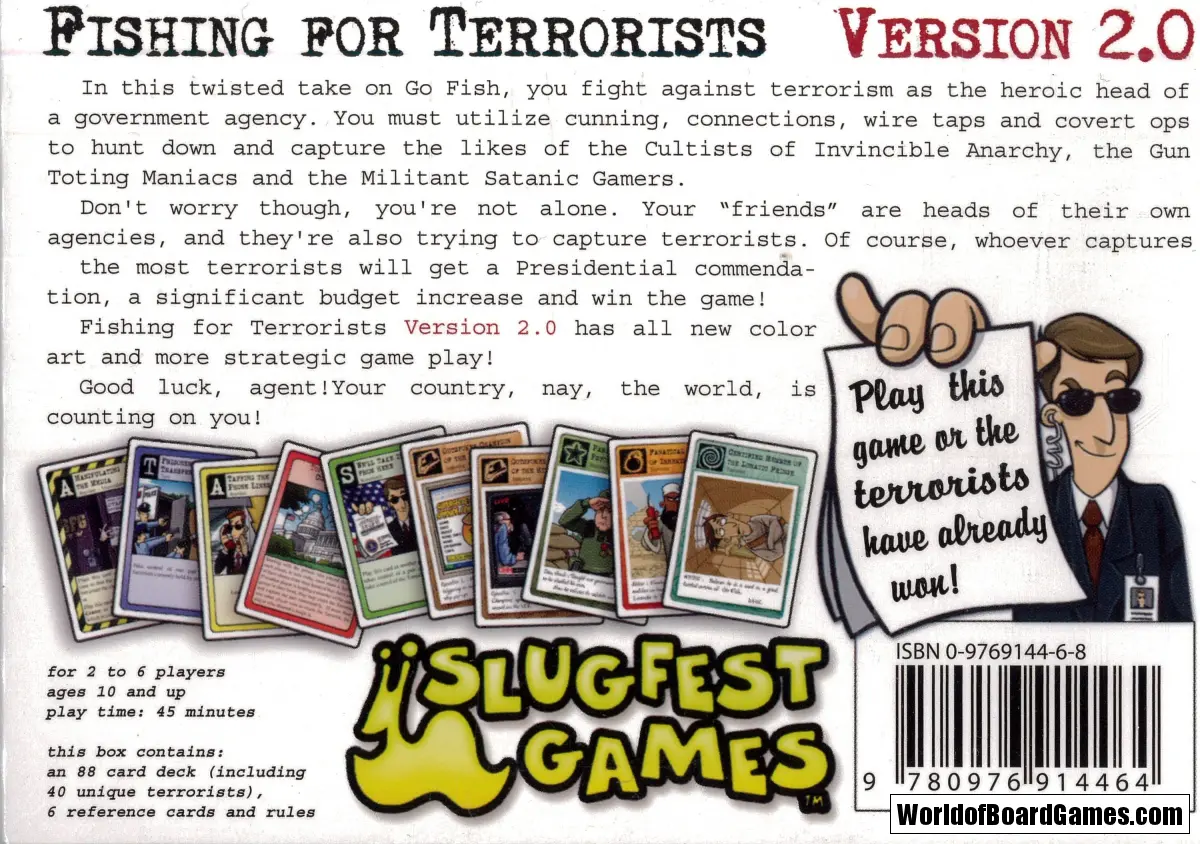 In Fishing for Terrorists, you and your friends are the heads government agencies, charged to fight against the forces of Terror! You must utilize cunning, covert ops, your friends in the Senate, and old fashioned wire taps to capture the likes of the Proponents of Earth's Total Annihilation, the Certified Members of the Lunatic Fringe, and the Apathetic Atheists.