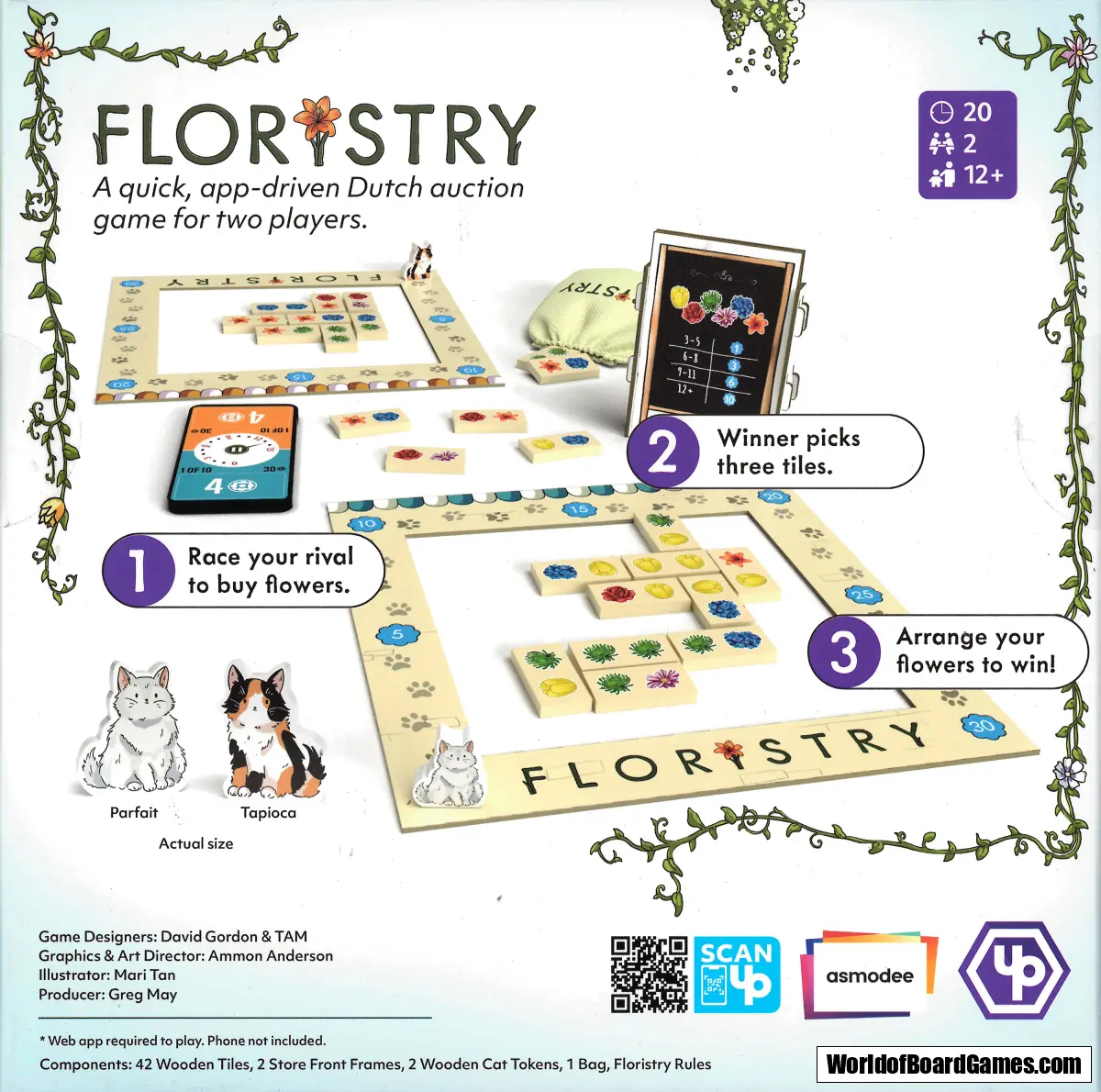 Floristry is a 2 player, tile-laying game. Players compete at the historic Aalsmeer Dutch Auction to win the best flowers and then use them to create the most charming window display.