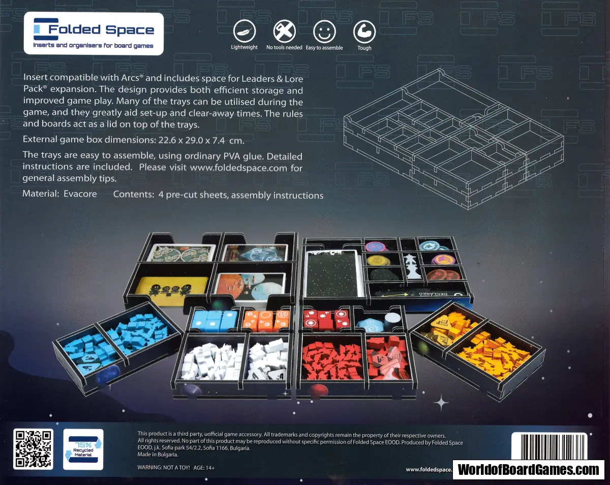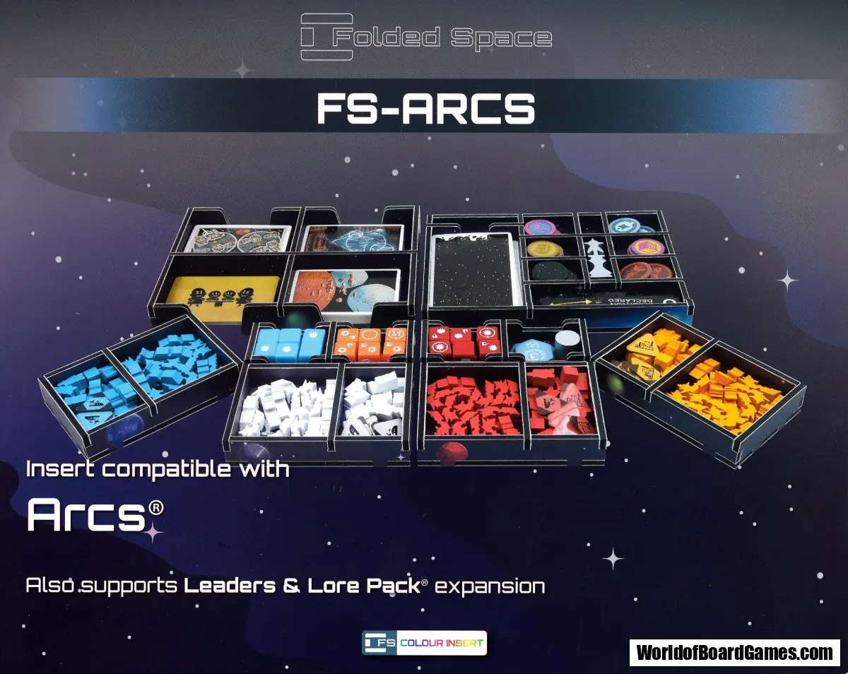Full colour insert compatible with Arcs® base game box. Includes space for the Leaders & Lore Pack expansion.