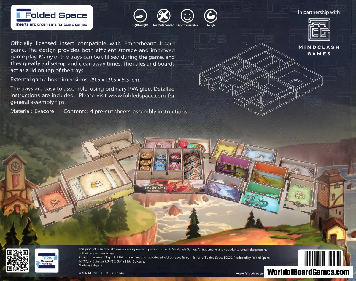 The design provides both efficient storage and improved game play. Many of the trays can be utilised during the game, and they greatly aid set-up and clear-away times. The rules and boards act as a lid on top of the trays.
