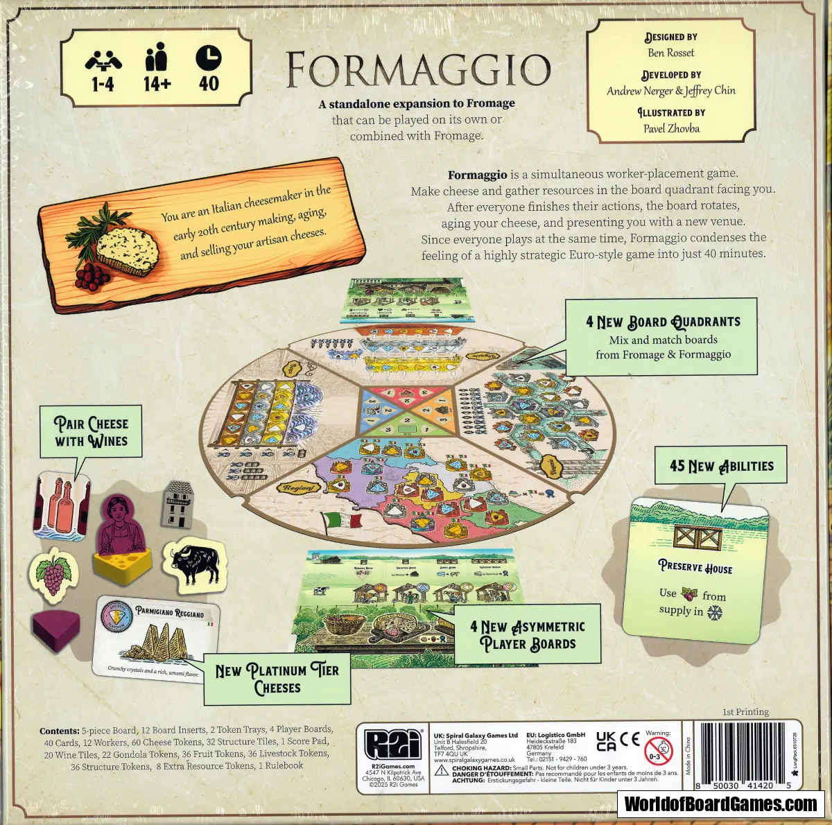 Formaggio is a standalone expansion for Fromage. With both games put together, you can combine any 4 board quadrants, and draft any combination of structure tiles for more variety and more paths to victory.