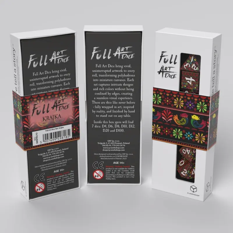 Full Art Dice™ Set: Krajka transforms Polish folk weaving into art. The traditional krajka pattern flows in full color across seven dice, uniting symmetry, history, and precision. Each roll feels like a small act of cultural artistry. Clear runic digits make every throw easy to read — and hard to forget. These dice let you be a connoisseur of your own making.