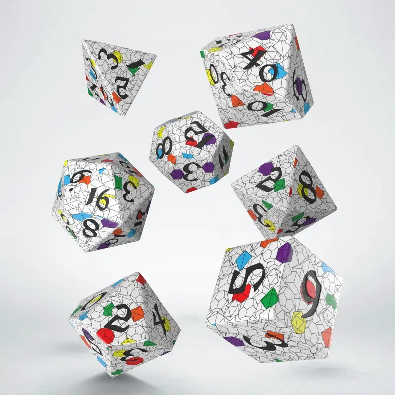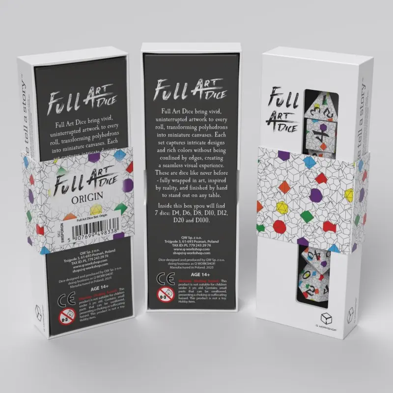 Full Art Dice™ Set: Origin is a tribute to geometry and creation. Black-and-white outlines of polyhedrons flow seamlessly across seven dice, forming a continuous design of pure balance and symmetry. Each roll feels like a glimpse into the art of form itself. Clear runic digits make every throw easy to read — and hard to forget. These dice let you be a connoisseur of your own making.