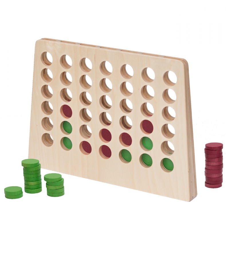 Stort Fyra i rad tillverkat helt i trä. Spelet är stabilt och hållbart. Rejäla spelbrickor i trä. Brädet är 39x28 cm. Vikt 1,5 kg. Levereras med 42 spelbrickor Formgivare: Magnus Olsson