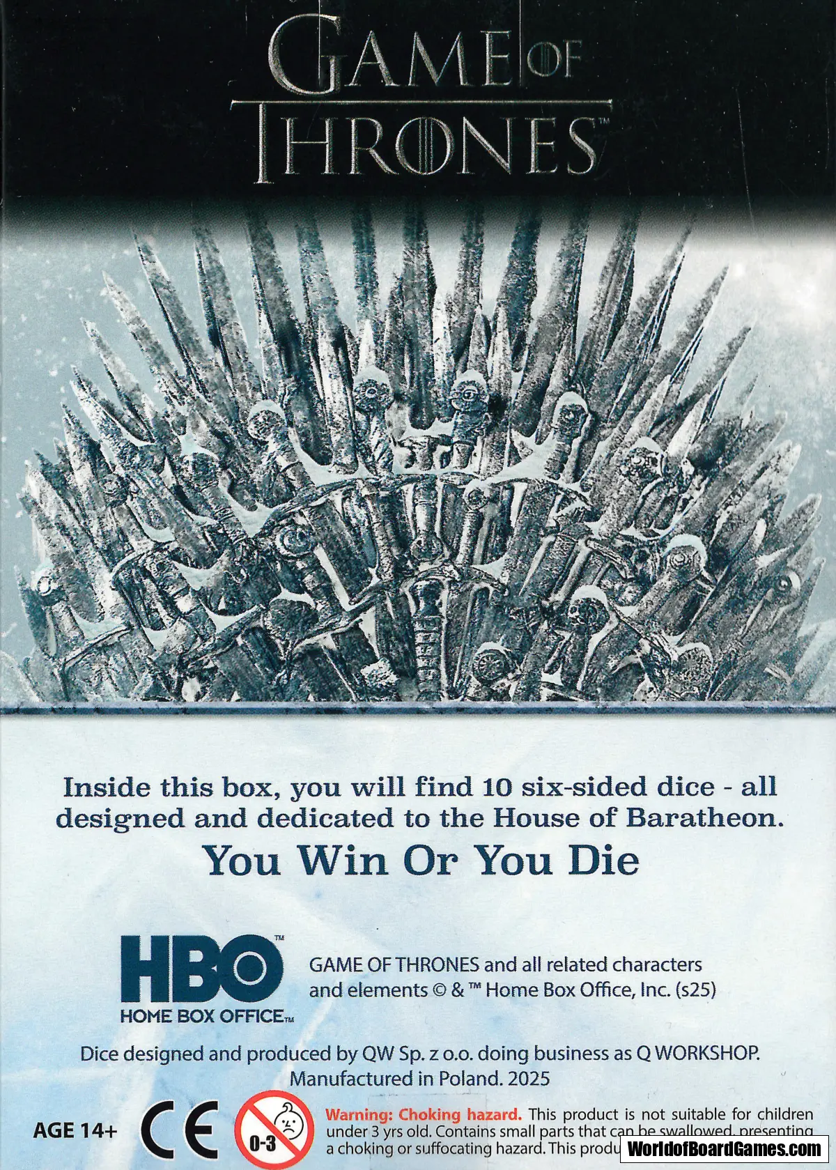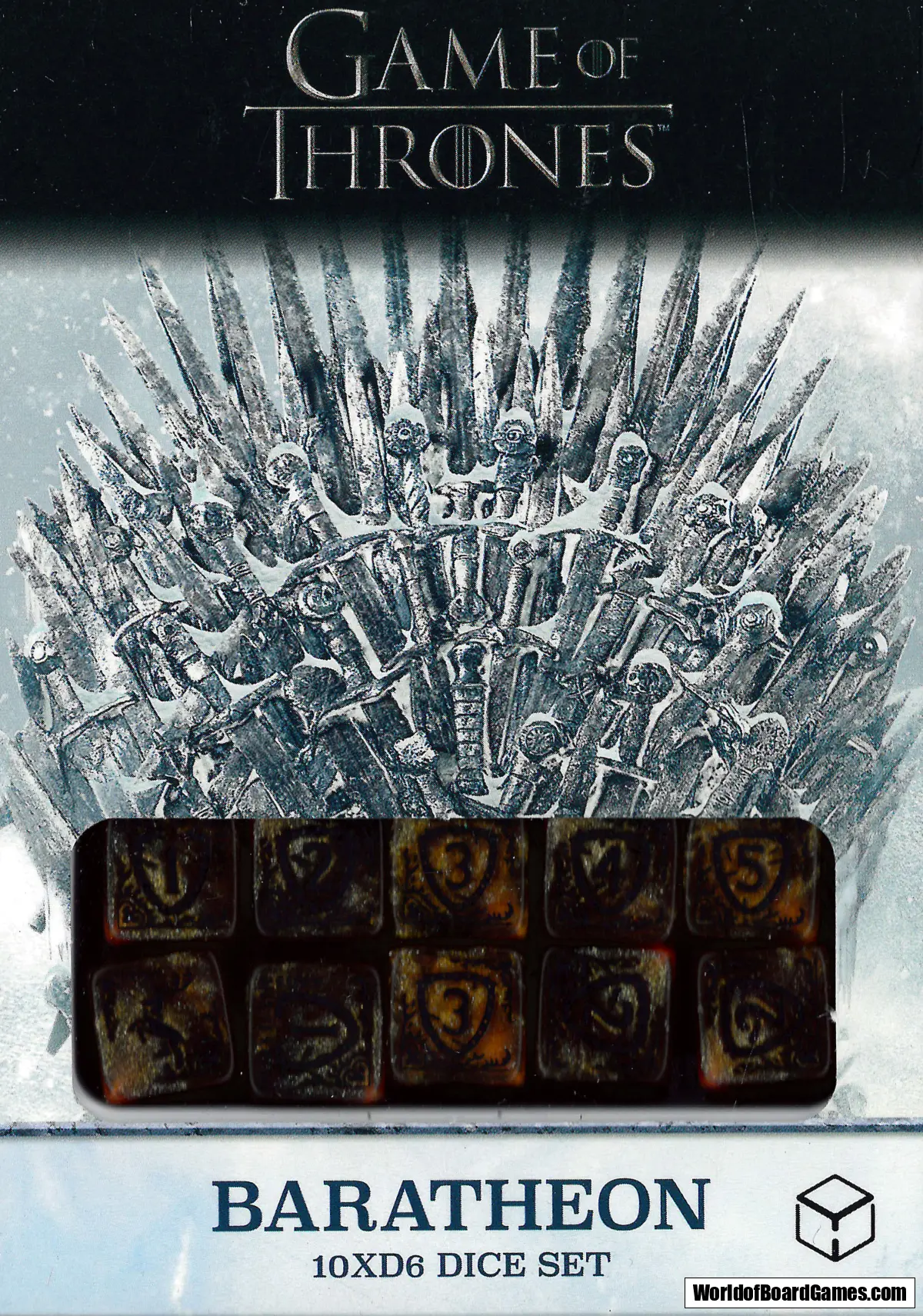 House Baratheon – The highest value faces of each dice feature the crowned stag as the Baratheon sigil, while the lowest face is adorned with its motto, “Ours is the Fury.”
