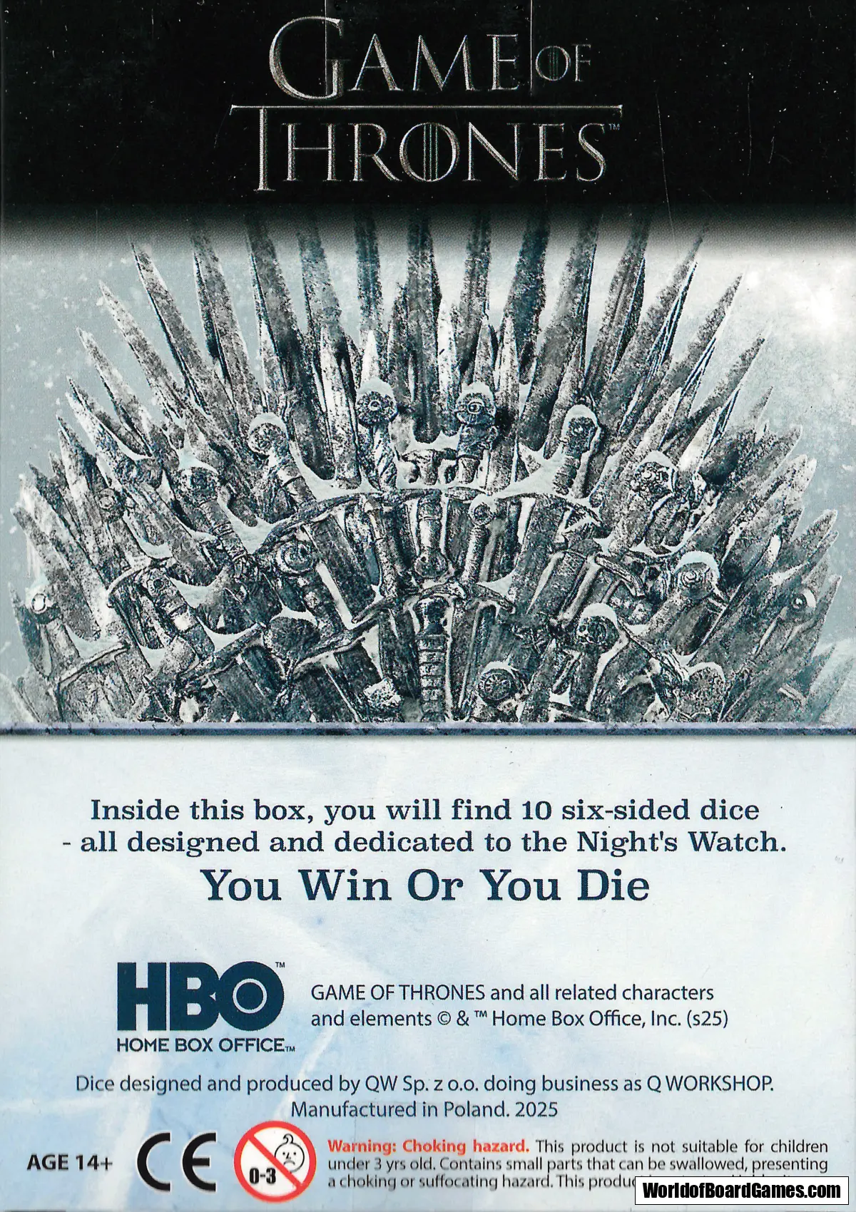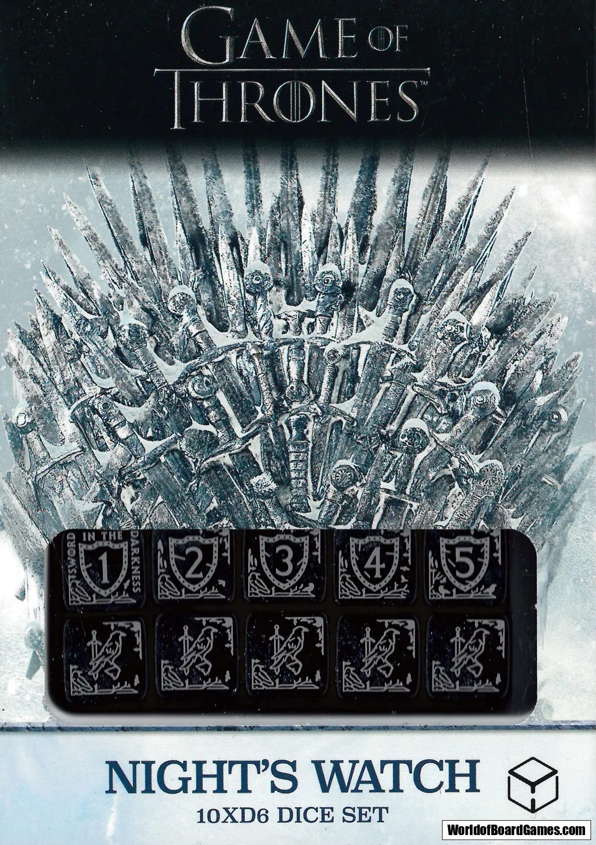 The Night’s Watch – The highest value faces of each dice feature the sword and the raven as Night’s Watch symbols, while the lowest face is adorned with its motto “Sword in Darkness”.