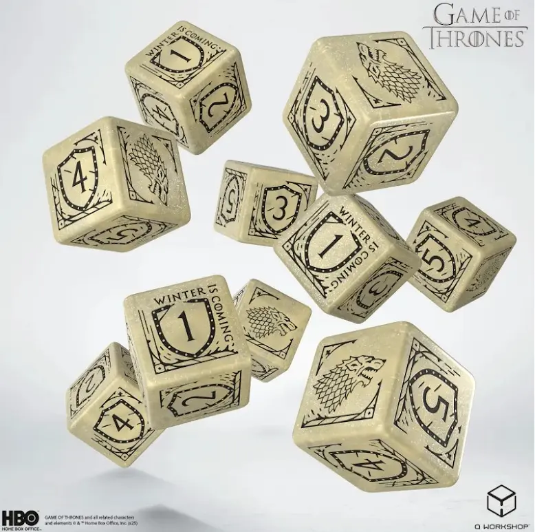 This officially licensed dice set reflects the iconic colors of House Stark, mirroring its banner with shimmering beige dice and deep black engravings. Each six-sided die features the direwolf sigil on the highest face and the house motto, "Winter is Coming," on the lowest. A fitting tribute to the North, designed for those who value honor, resilience, and an unwavering sense of duty.
