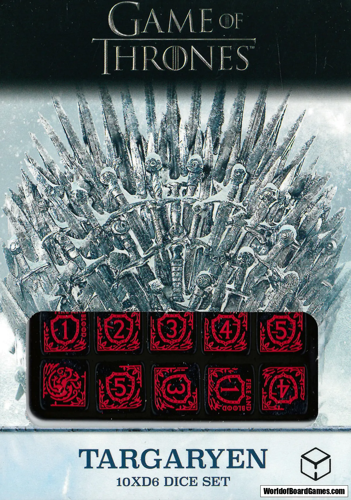 House Targaryen – The highest value faces of each dice feature the three-headed dragon as the Targaryen sigil, while the lowest face is adorned with its motto, “Fire and Blood.”
