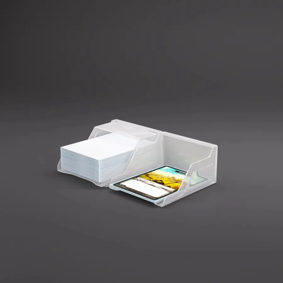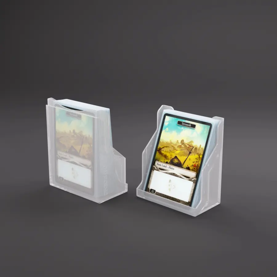 “If you’re gonna stand, stand like a Bastion!”– The Bastion 50+ is a very compact and rock-solid deck box to safely protect 50+ double-sleeved cards in Closable Inner Sleeves. It is ideal for decks with 55+ double-sleeved cards in standard inner sleeves. Due to translucent materials and smart positioning of the closing flaps, the top card is fully visible from the outside without opening the box. The innovative secure click-lock mechanism protects your deck while still allowing easy access. The Bastion consists of 2 symmetrical parts that easily convert into a card pile and discard pile holder. It is perfect for a huge variety of trading card games. Thanks to its modular design, the Bastion fits perfectly into other Gamegenic products. It also comes with a write-on sticker for personalization. The Bastion is available in 10 different colors, including an exclusive mix & matched black/clear version.