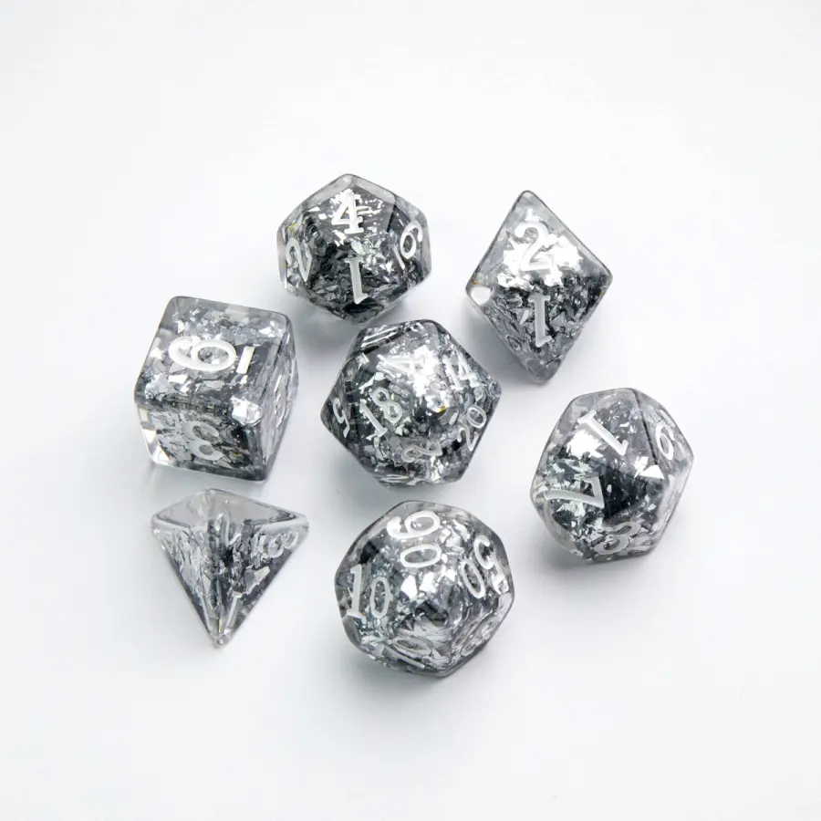 Choose your weapon! This dice set contains a D4, a D6, a D8, two D10 (10 and 00), a D12 and a D20. All dice are round-cornered and manufactured at a premium level. The Candy dice are infused with beautiful glitter flakes. They are packed in a window cardboard box that displays all dice at the front.