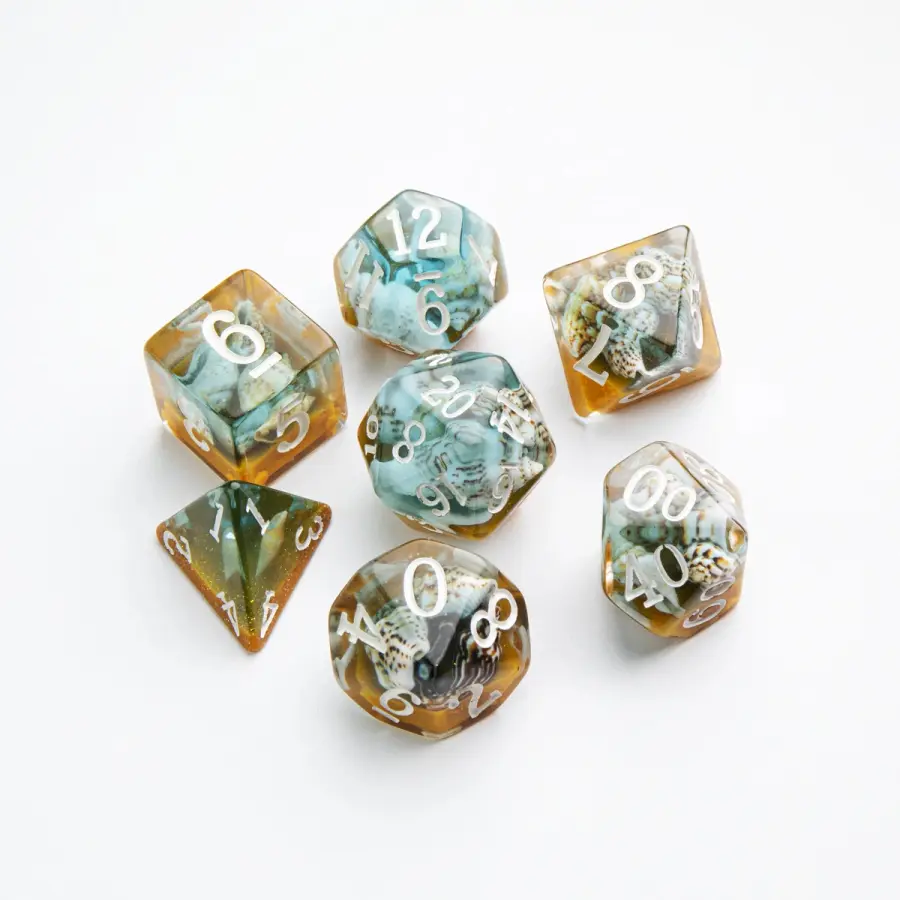 Choose your weapon! This dice set contains a D4, a D6, a D8, two D10 (10 and 00), a D12 and a D20. All dice are round-cornered and manufactured at a premium level. The Embraced Dice have an interesting item inside the cube and will make your game night a critical hit. They are packed in a window cardboard box that displays all dice at the front.