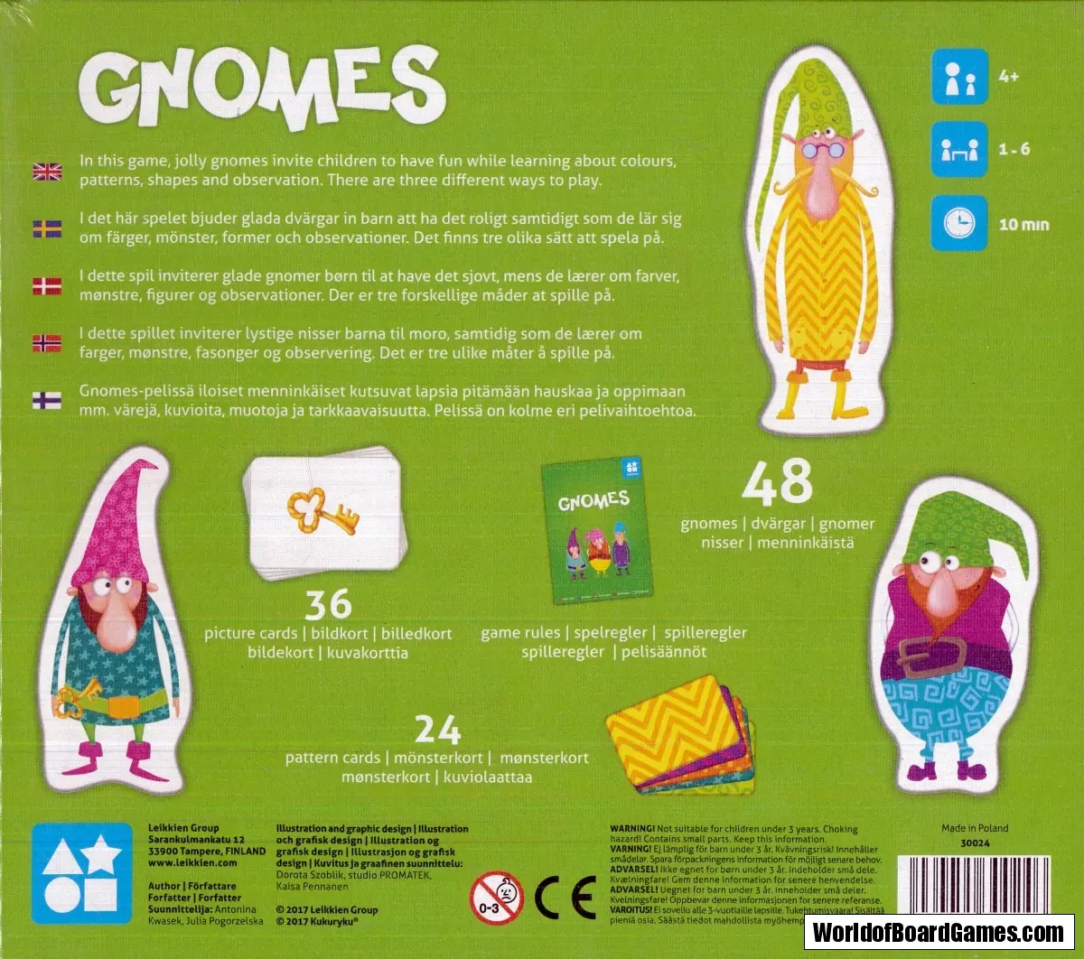 I det här spelet bjuder glada dvärgar in barn att ha det roligt samtidigt som de lär sig om färger, mönster, former och observationer. Det finns tre olika sätt att spela på.