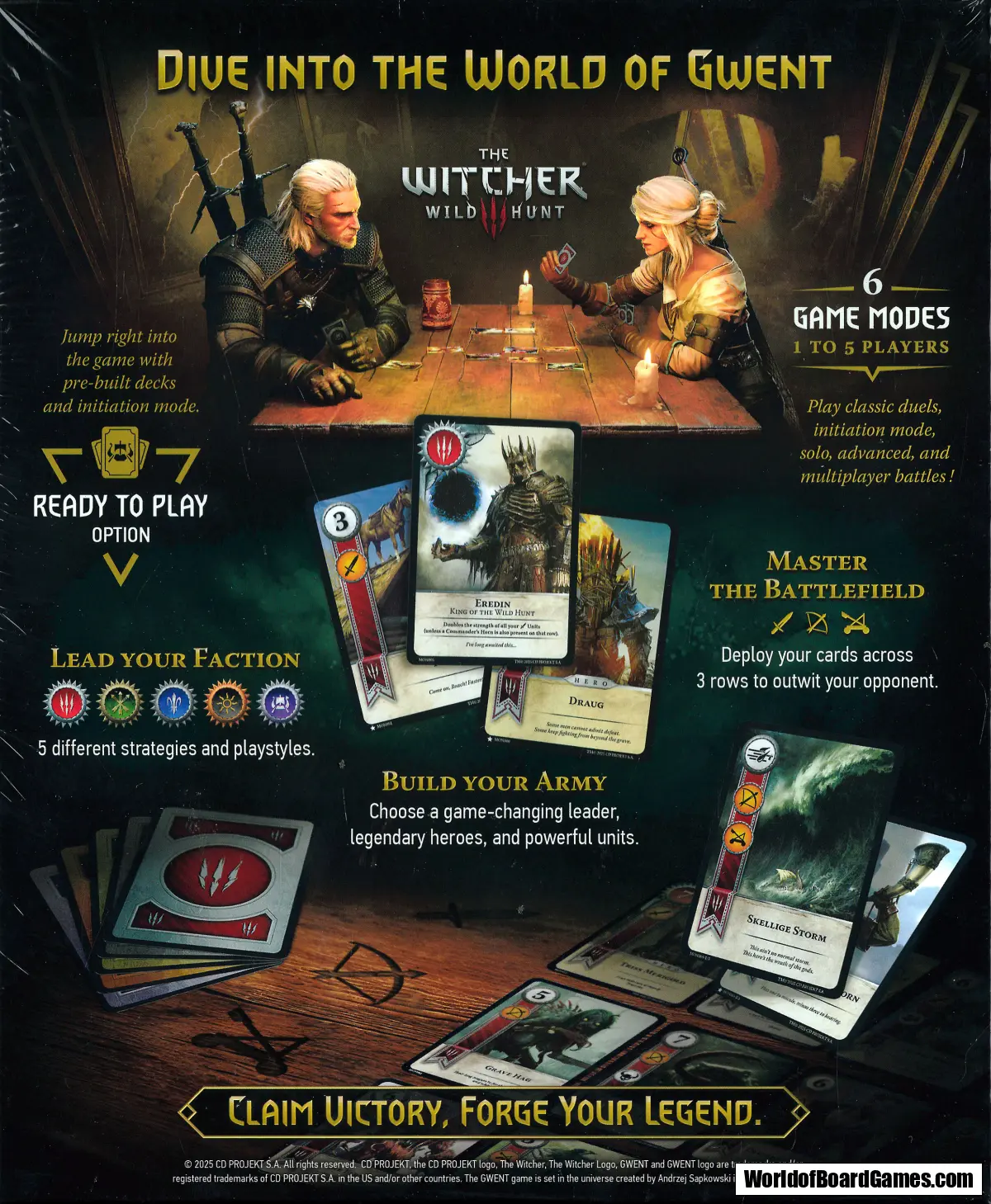 Spela som en av fem faktioner Monsters, Nilfgaardian Empire, Northern Realms, Scoia'tael och Skellige i det episka kortspelet baserat från det i TW3. Varje fraktionslek består av vackert illustrerade kort med ikoniska karaktärer och förmågor från Witcher-världen.