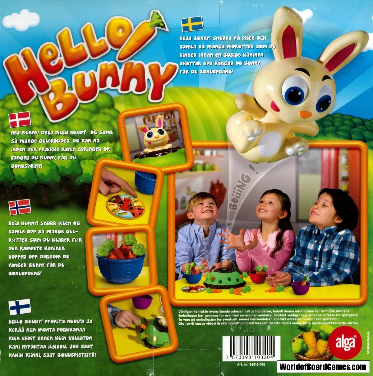 Den busiga kaninen äter upp alla morötterna! Vem kan skrämma iväg honom eller kanske t o m fånga honom när han flyger upp i luften? Ett underbart spel för de yngre barnen. Nominerat till Årets spel i flera länder. Kräver inga batterier! För 2-4 spelare. Från 4 år.