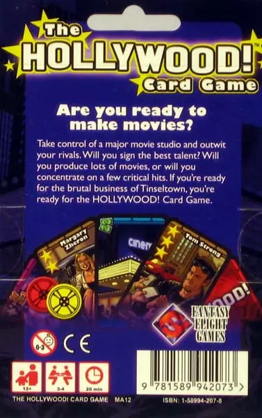 The Hollywood Card Game contains 64 cards, 16 film reel chips, and a rulesheet. The game is suitable for three to four players ages 8 and up, and can be played in 15 minutes.