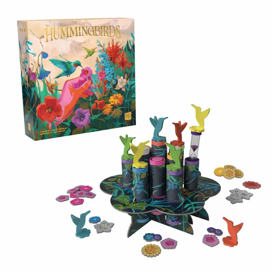 Time your moves wisely and collect the most nectar tokens! In Hummingbirds, players take turns claiming flowers atop hidden sand timers, maneuvering for better positions, and checking for nectar. If a sand timer beneath a flower has run out, you collect a nectar token - but if you check too soon, you'll lose one! The longer you wait, the greater the reward, but misjudging the timing could cost you. Once all nectar tokens of a single color are claimed, the game ends, and the player with the highest total nectar value wins.