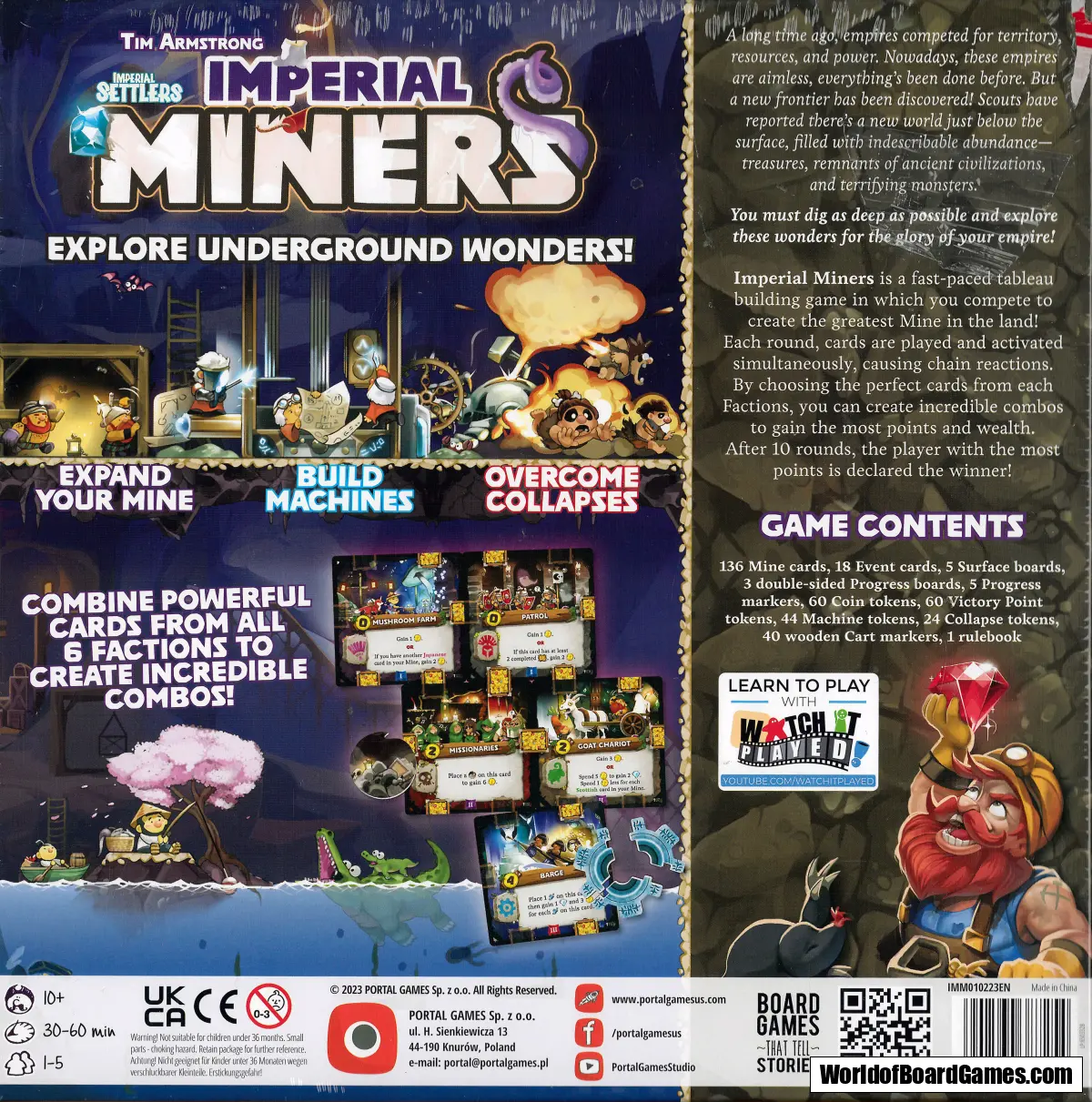 In Imperial Miners players build their own mines by playing cards to their tableau. They start from the ground floor and develop downwards. Each time a card is added to the mine it activates itself and all the cards above it rewarding a player with satisfying combos. Cards belong to six different factions and offer various abilities. Players are free to mix different factions in their mines for better results.