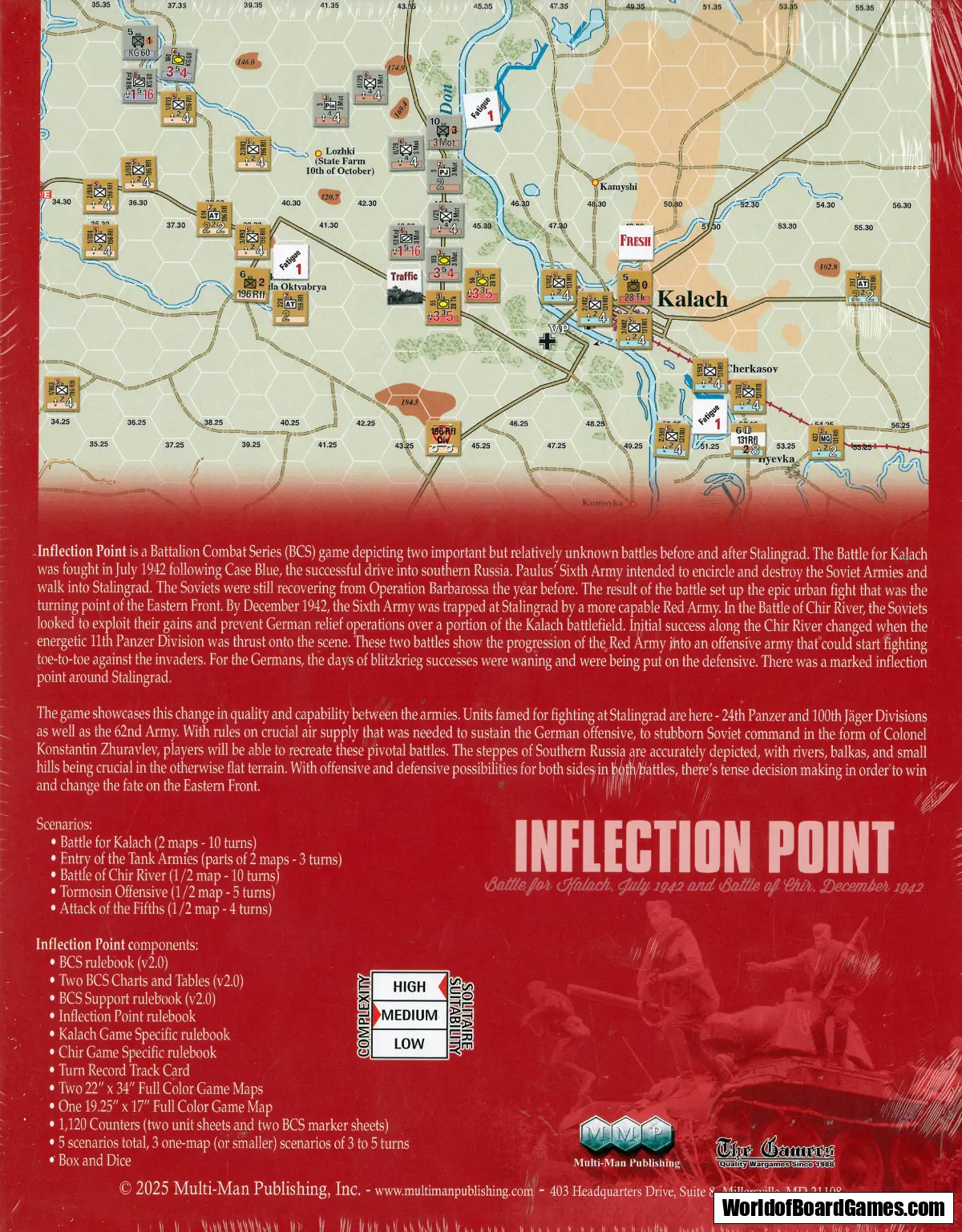 Inflection Point is a Battalion Combat Series (BCS) game depicting two important but relatively unknown battles before and after Stalingrad. The Battle for Kalach was fought in July 1942 following Case Blue, the successful drive into southern Russia. Paulus' Sixth Army intended to encircle and destroy the Soviet Armies and walk into Stalingrad. The Soviets were still recovering from Operation Barbarossa the year before. The result of the battle set up the epic urban fight that was the turning point of the Eastern Front. By December 1942, the Sixth Army was trapped at Stalingrad by a more capable Red Army. In the Battle of Chir River, the Soviets looked to exploit their gains and prevent German relief operations over a portion of the Kalach battlefield. Initial success along the Chir River changed when the energetic 11th Panzer Division was thrust onto the scene. These two battles show the progression of the Red Army into an offensive army that could start fighting toe-to-toe against the invaders. For the Germans, the days of blitzkrieg successes were waning and were being put on the defensive. There was a marked inflection point around Stalingrad.