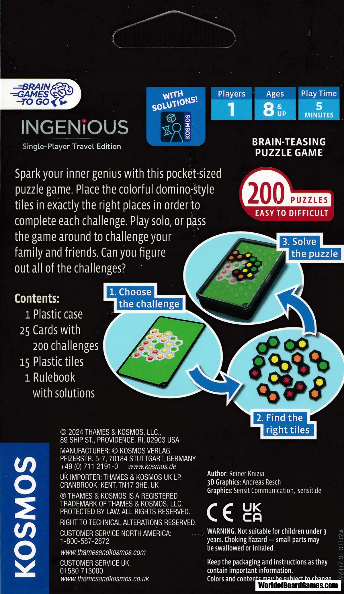 With 200 challenges in four difficulty levels and a compact case, Ingenious provides hours of puzzle-solving fun, virtually anywhere. Play solo, or pass around to challenge your family and friends. Put your logical thinking skills to the test! Can you master all of the challenges?