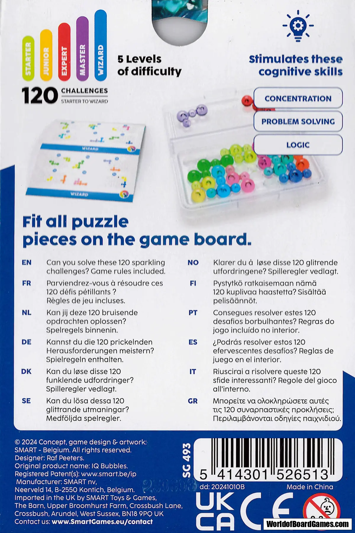 Utmana din hjärna med IQ Bubbles! Detta beroendeframkallande pusselspel utmanar spelare att placera alla färgglada, genomskinliga bubbelbitar på det resevänliga spelbrädet/fodralet. Med 120 utmaningar att lösa – från Nybörjare till Trollkarl – är IQ Bubbles perfekt för både barn och vuxna!