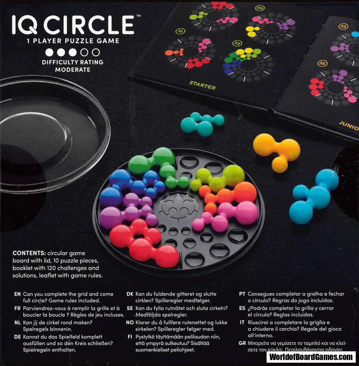 IQ Circle är ett pussel som överträffar vanliga pussel med sina klotformade bitar. Kan du fylla hela spelbrädet och slutföra cirkeln? Med 120 utmaningar från Lätt till Expert är detta lyxiga spel en perfekt gåva till alla pusselentusiaster.