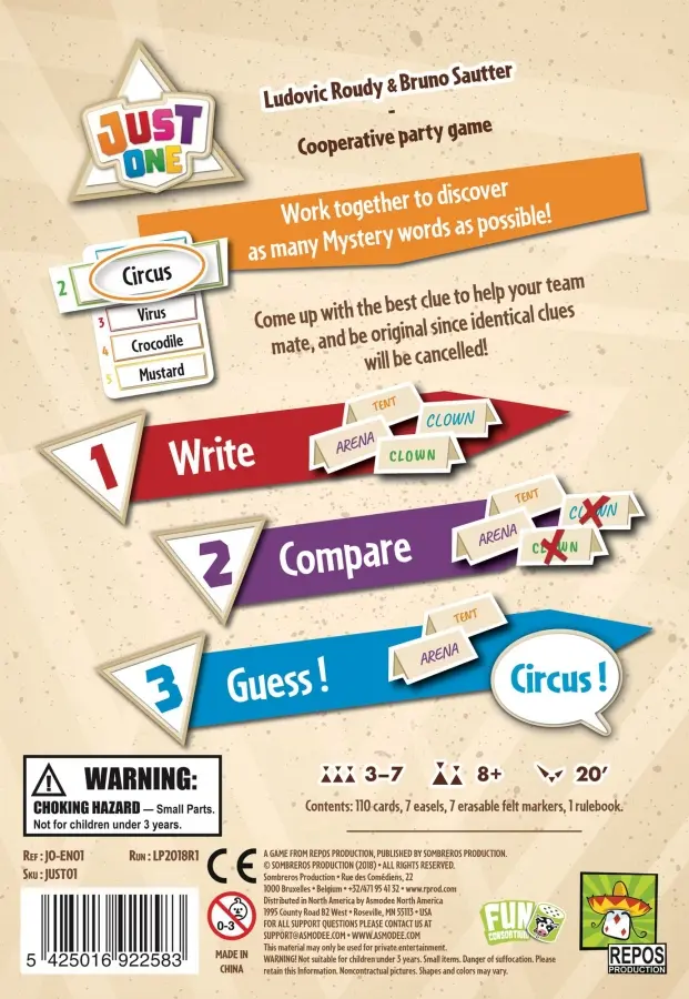 Just One is a cooperative party game in which you play together to discover as many mystery words as possible. Find the best clue to help your teammate. Be unique, as all identical clues will be cancelled!
