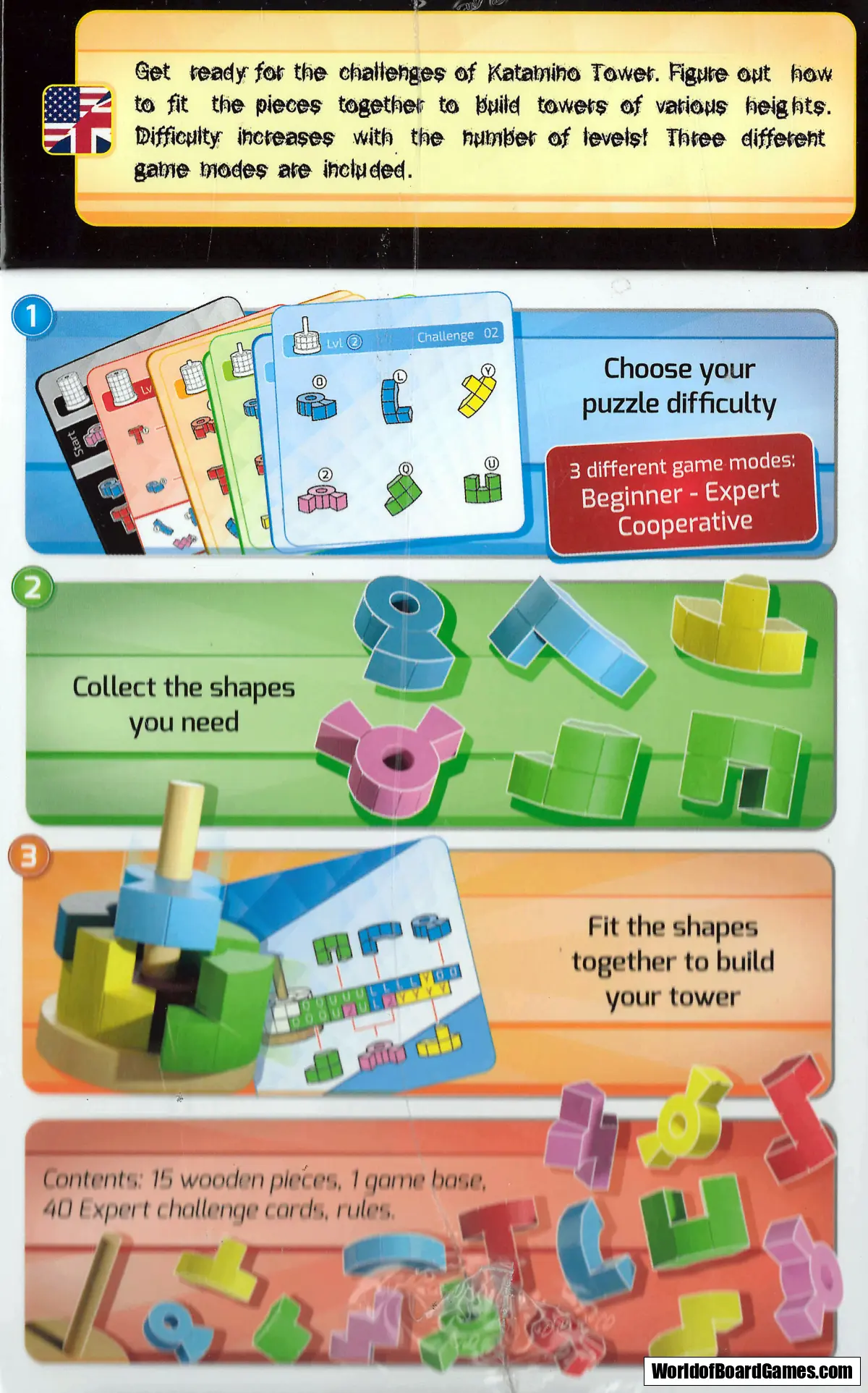 For solo play, the game transforms into a challenging puzzle. Depending on the chosen difficulty level, players aim to reconstruct a tower with 2, 3, 4, or 5 levels. The Beginner Mode offers helpful piece-selection clues, while the Expert Mode introduces Challenge cards and solutions, boasting over 45,000 distinctive solutions in total.