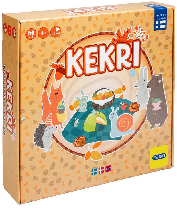 Kekri är en kul och lätt kombination av minnesspel och brädspel. Spelarna tar sig fram längs stegen på spelplanen genom att vända upp brickor i samma färg eller form som brickan på det föregående steget. Spänningen stiger, när överraskande stormvindar blåser och blandar om brickorna! Den första spelaren som når kalaset mitt på spelplanen vinner och får mumsa på den första tårtbiten.
