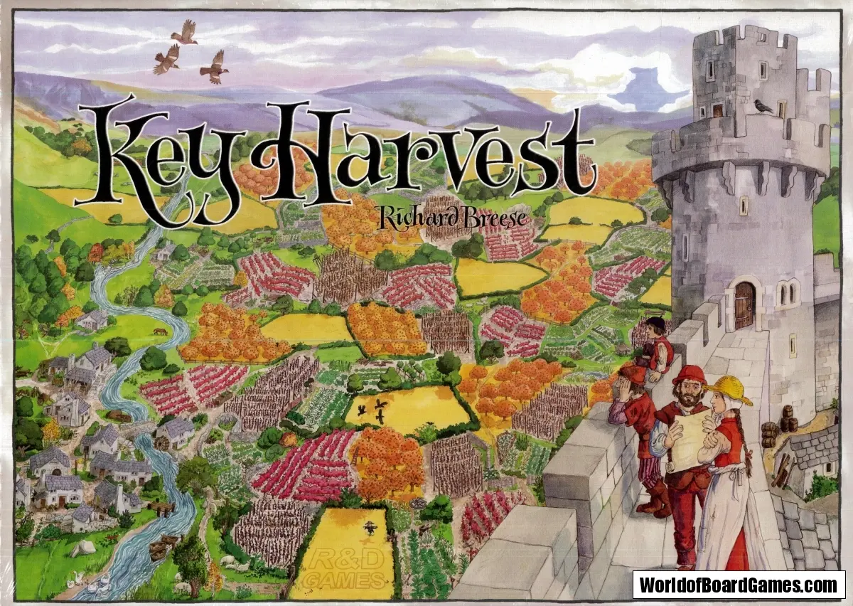 The object of the game in Key Harvest is to score the most points. Players score points by placing tiles on their own country board. Each player has the same board, but there is only one of each tile, so there is competition when two players want the same tile. One point is scored for each field tile in the player’s largest group of connected field tiles and two points for each tile in their second largest connected group.