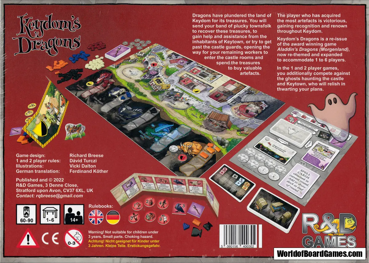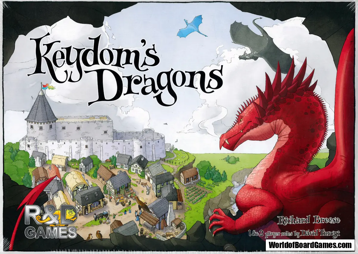 In competition with other players, in Keydom's Dragons you lead a band of eight plucky townsfolk (workers). You will send some of your workers into the caves while the dragons are abroad in order to recover their treasure hoards piece by piece. Other workers will acquire help and assistance in the town, or attempt to find a way past the castle guards using strength or bribes, opening the way for your remaining workers to enter the castle rooms and spend the treasures your team has recovered to buy valuable artefacts.