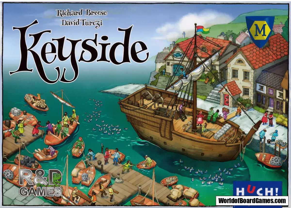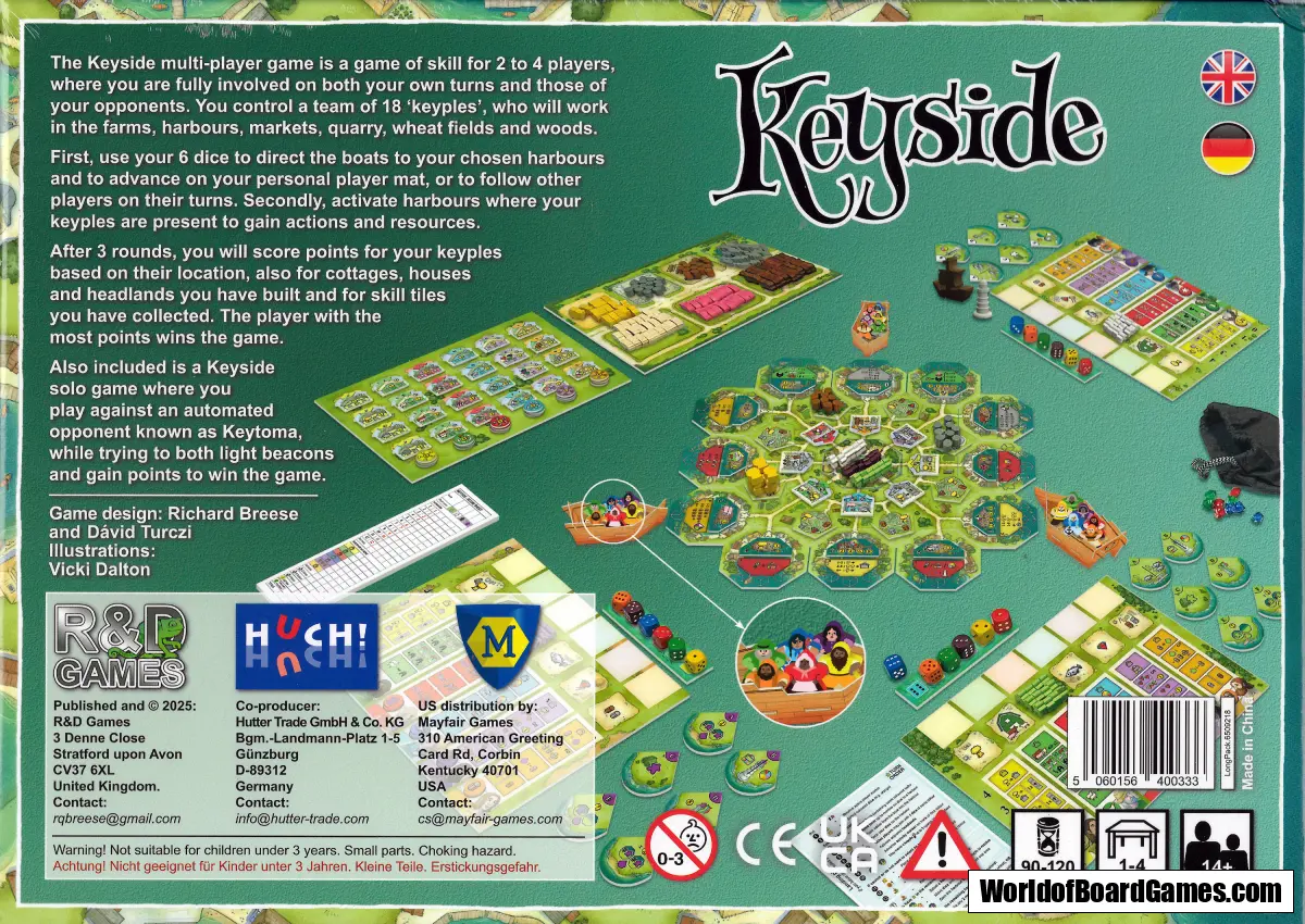 Keyside is played over 3 years. Each year is divided into two phases: landing and resolving harbours. In the landing phase the lead player uses a die to move a boat into a harbour and then places a boatman, the die, and a worker into that harbour. Other players can join in. In the resolving harbour phase, the lead player chooses a harbour to resolve which contains one of their workers. All players with workers in that harbour will gain a benefi t such as gaining resources, animals, building a headland, access to farms, markets and skill tiles, worker movement and recruitment. Players score points based on the harbour scoring criteria multiplied by the number of their workers in the harbour. In addition, points are scored for headlands, skill tiles and for buildings in the player’s village. The player with the most points wins the game.