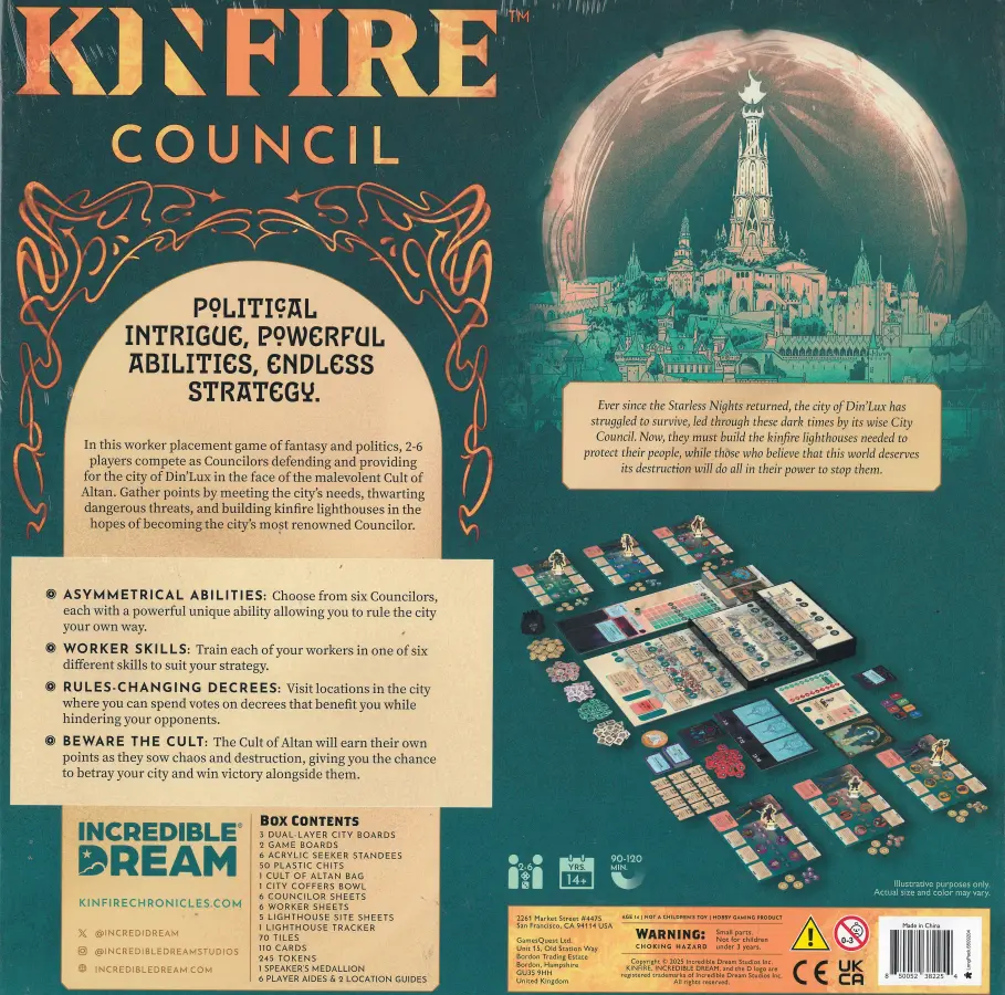 Kinfire Council is a competitive game of strategy and politics. As a member of the Council, you've been charged with rebuilding the great city of Din'Lux and defending it from the dangers of the Starless Nights.