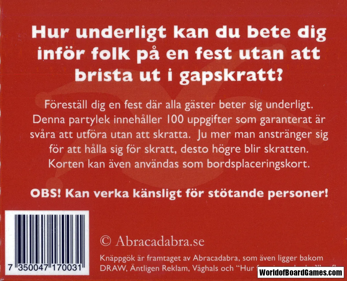Knäppgök är en partylek bestående av 100 kort med uppgifter som garanterat är svåra att utföra utan att själv skratta. Ju mer man anstränger sig för att hålla sig för skratt, desto högre blir skratten! Korten kan delas ut till festdeltagarna men kan även användas som bordsplaceringskort.