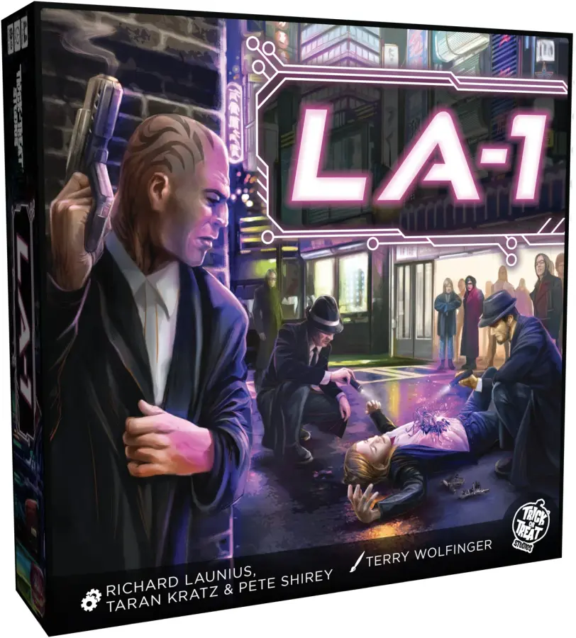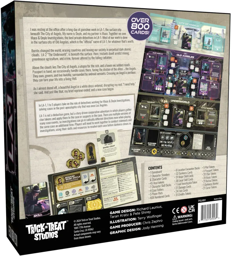 In the story-driven, co-operative adventure game LA-1, you take on the role of detectives working for Mace & Doyle Investigations who are helping one another to resolve cases in the post-apocalyptic city that was once Los Angeles. Each case can be played individually or as part of a campaign. Because of the multiple cards that can send investigations in different directions, it's possible to play each case more than one time, having different situations and outcomes each time. But cases must be solved before the Darkness closes in on all the investigators.