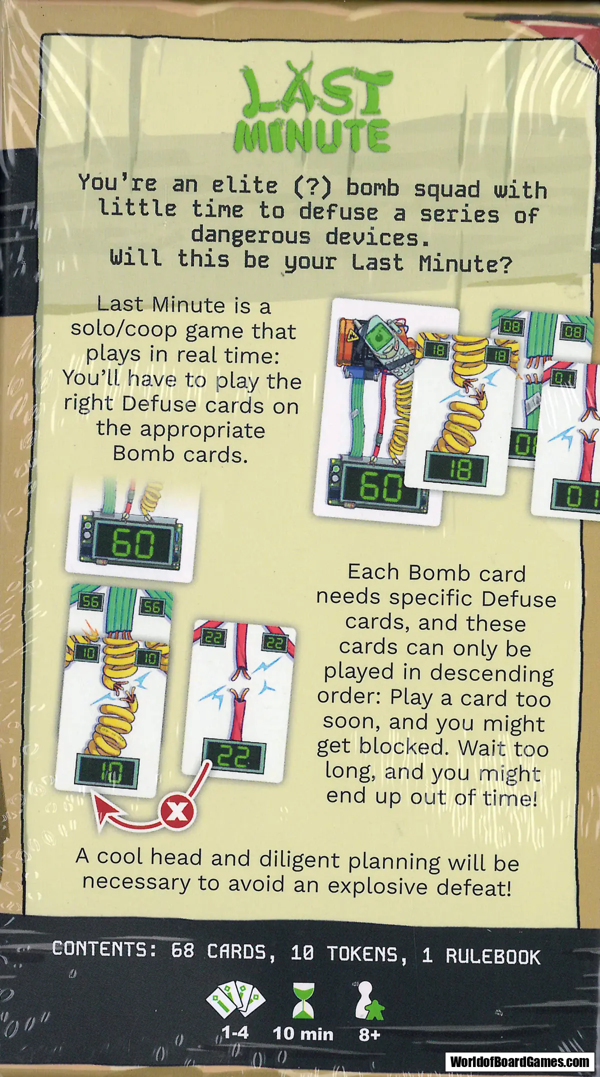 Last Minute is a solo/coop game that plays in real time: you’ll have to play the right Defuse cards on the appropriate Bomb cards, respecting a double timer condition. A cool head, fine planning and (if you face the challenge with friends) good teamwork will be necessary to avoid an explosive defeat!