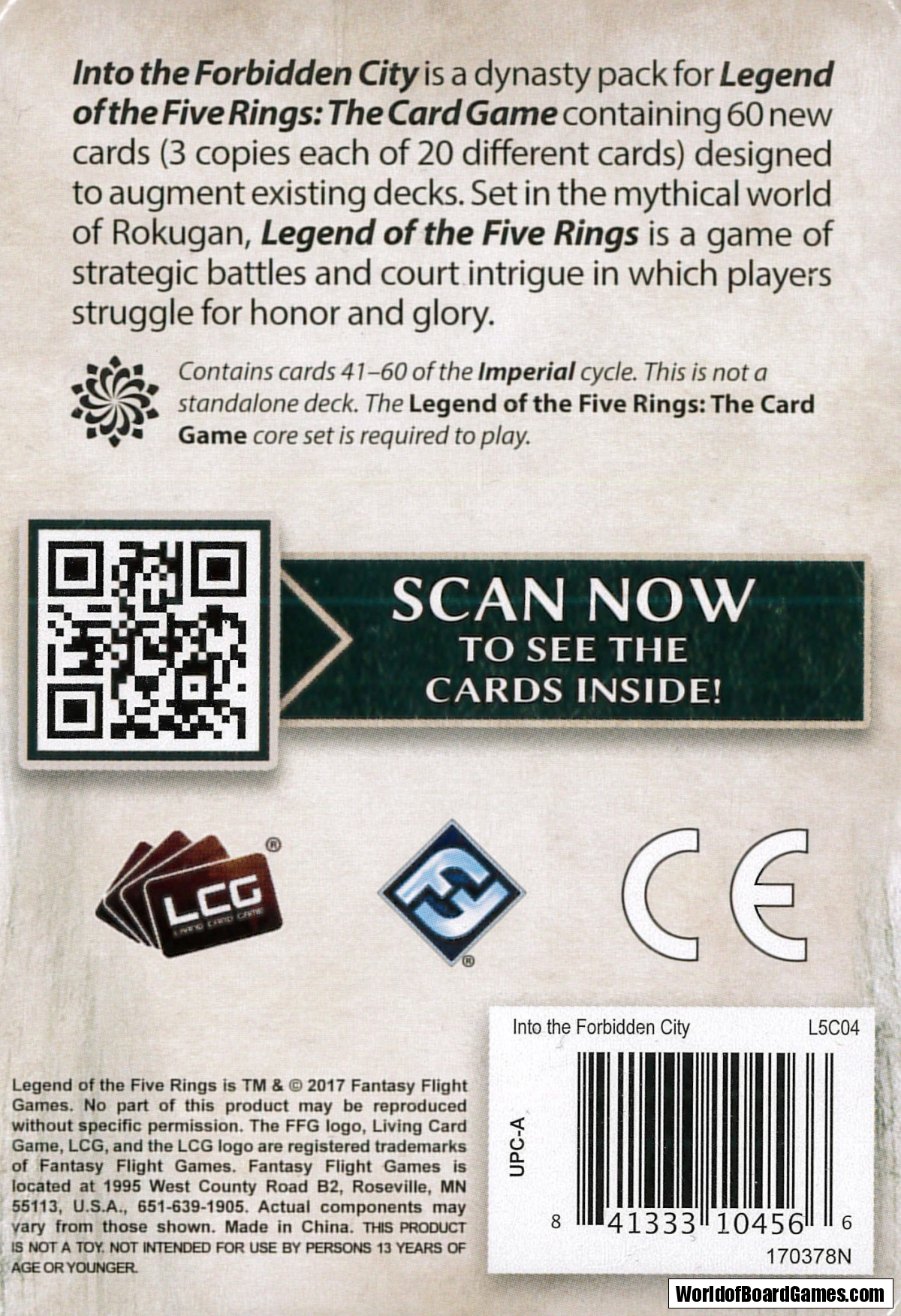 Experience the wonders of the Imperial Cycle with Into the Forbidden City, the third Dynasty Pack for Legend of the Five Rings: The Card Game. Each of the seven Great Clans receives new cards that continue to embrace and define the themes that began in the Legend of the Five Rings: The Card Game Core Set. Along the way, you’ll find a great assortment of cards focused on the Imperial City of Otosan Uchi. From neutral samurai sworn to the Imperial family, to Imperial magistrates from each of the Great Clans, to rewards for holding the Imperial Favor, this cycle draws you into the world of Otosan Uchi and the service of the Emperor.