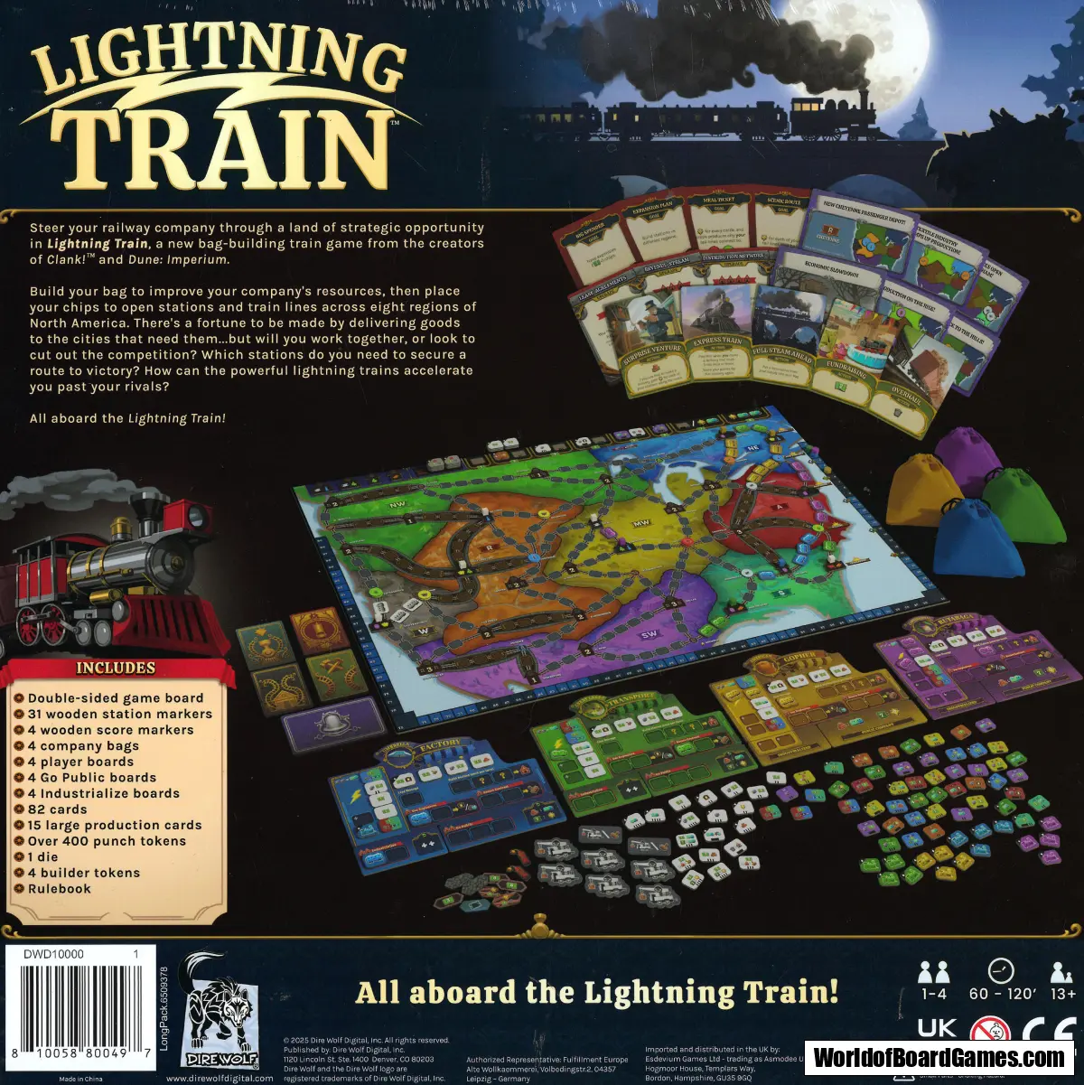 Build your bag to improve your company's resources, then place your chips to open stations and train lines across eight regions of North America. There's a fortune to be made by delivering goods to the cities that need them...but will you work together, or look to cut out the competition? Which stations do you need to secure a route to victory? How can the powerful lightning trains accelerate you past your rivals?